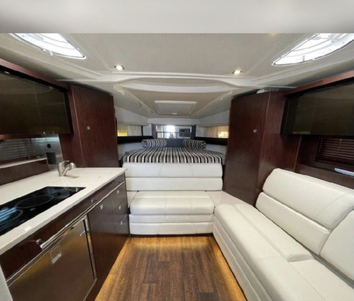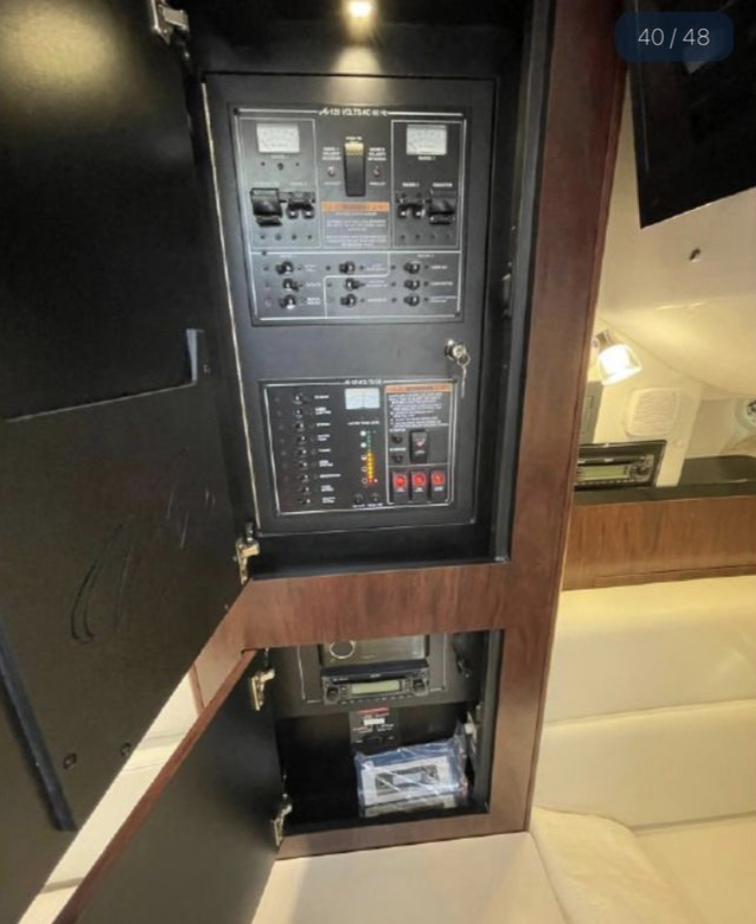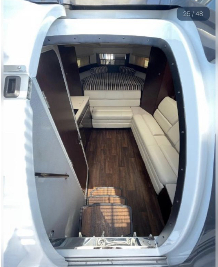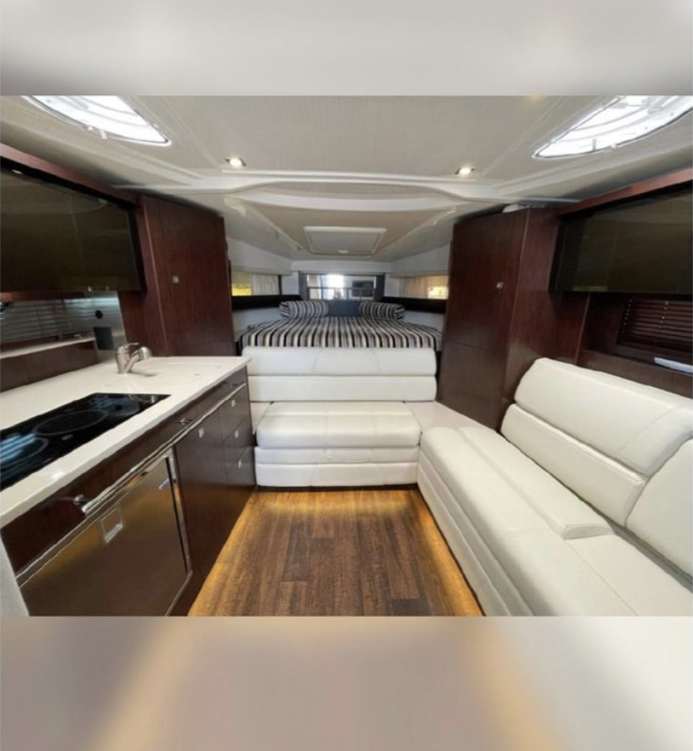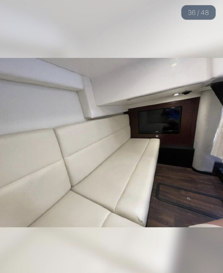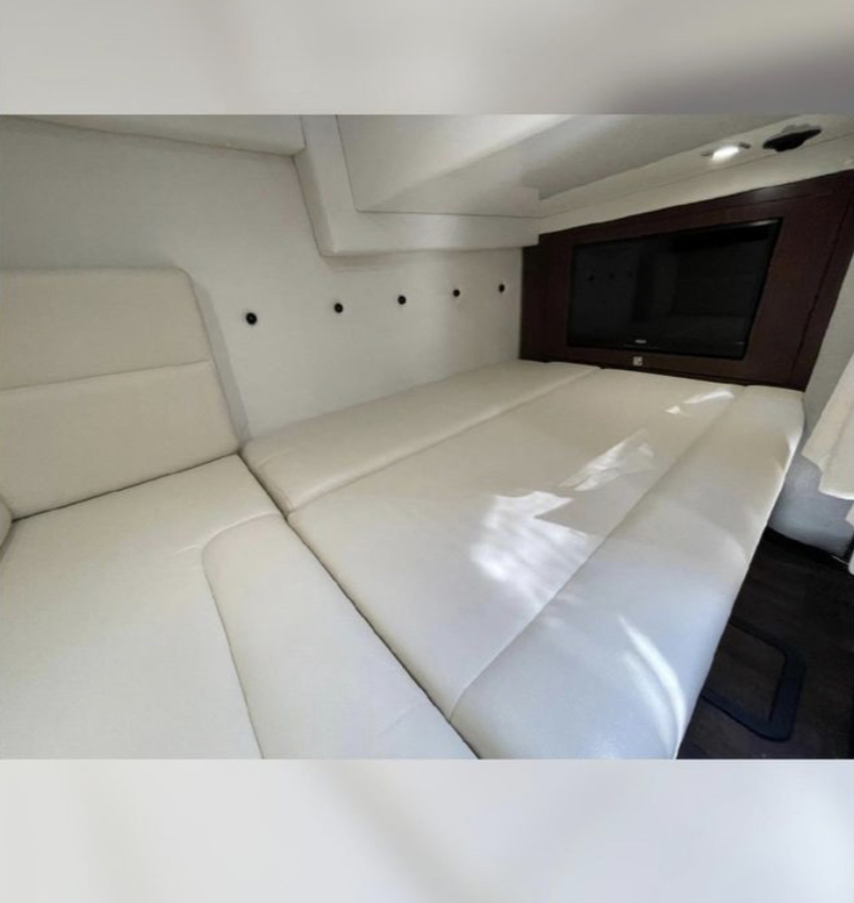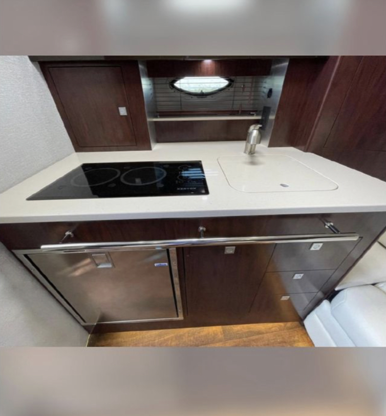 At the helm station, you will find a Raymarine display, dual Mercury Vessel Views, a joystick with a skyhook, air conditioning vents, and a Fusion audio display. The cockpit has a full wet bar, ample seating, and brand-new sea dek throughout.