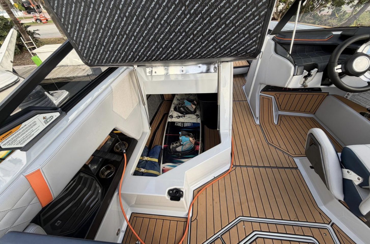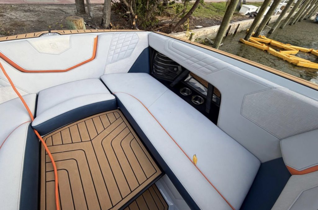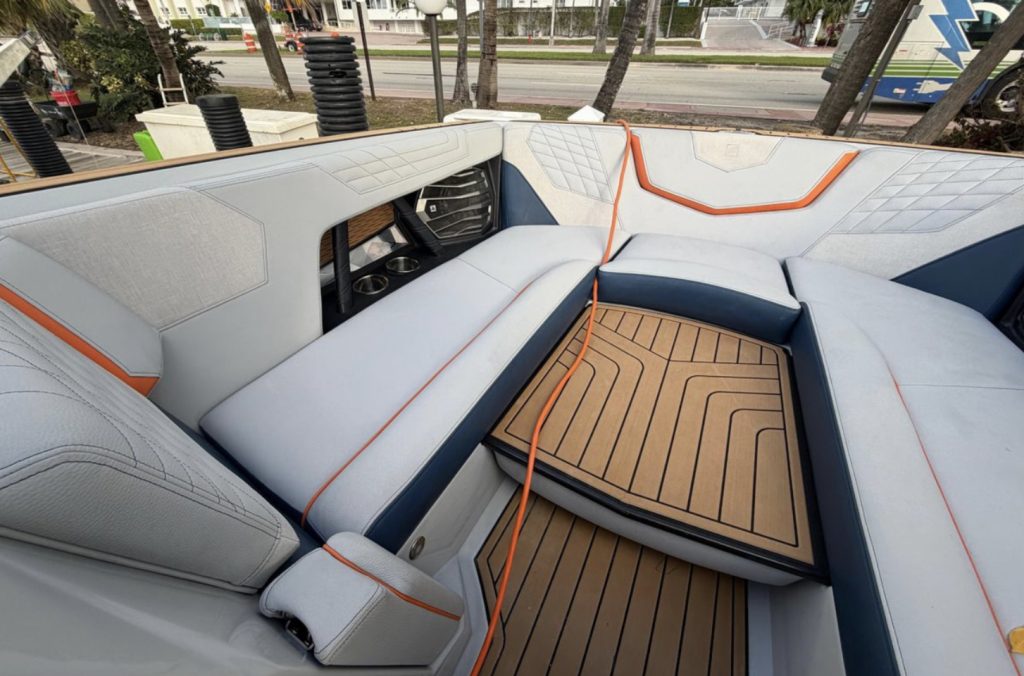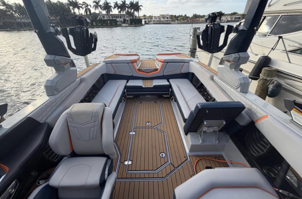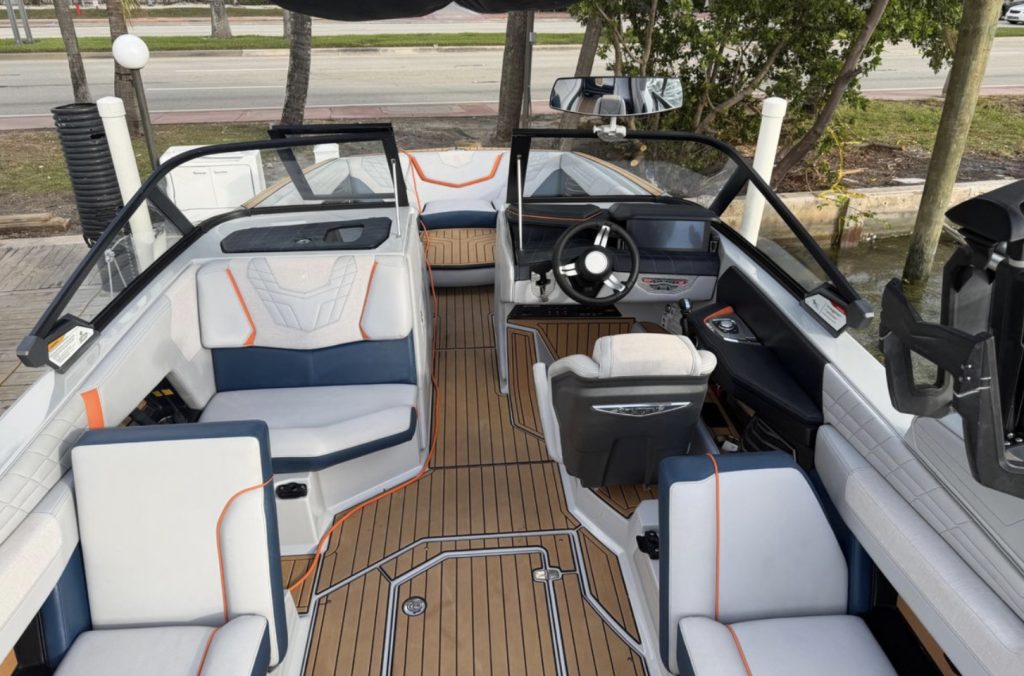 The G25 delivers one of the best surf waves and wakeboard wakes in the industry with its 3,600 pounds of ballast, advanced running surface, and NSS surf system. The 25-foot layout seats up to 19 comfortably with plush interior appointments, wraparound seating, premium stitching, extended sun shades, and Nautique’s signature helm featuring the touchscreen LINC system.