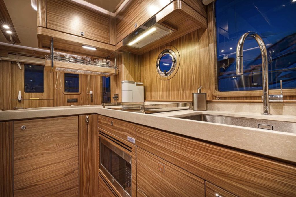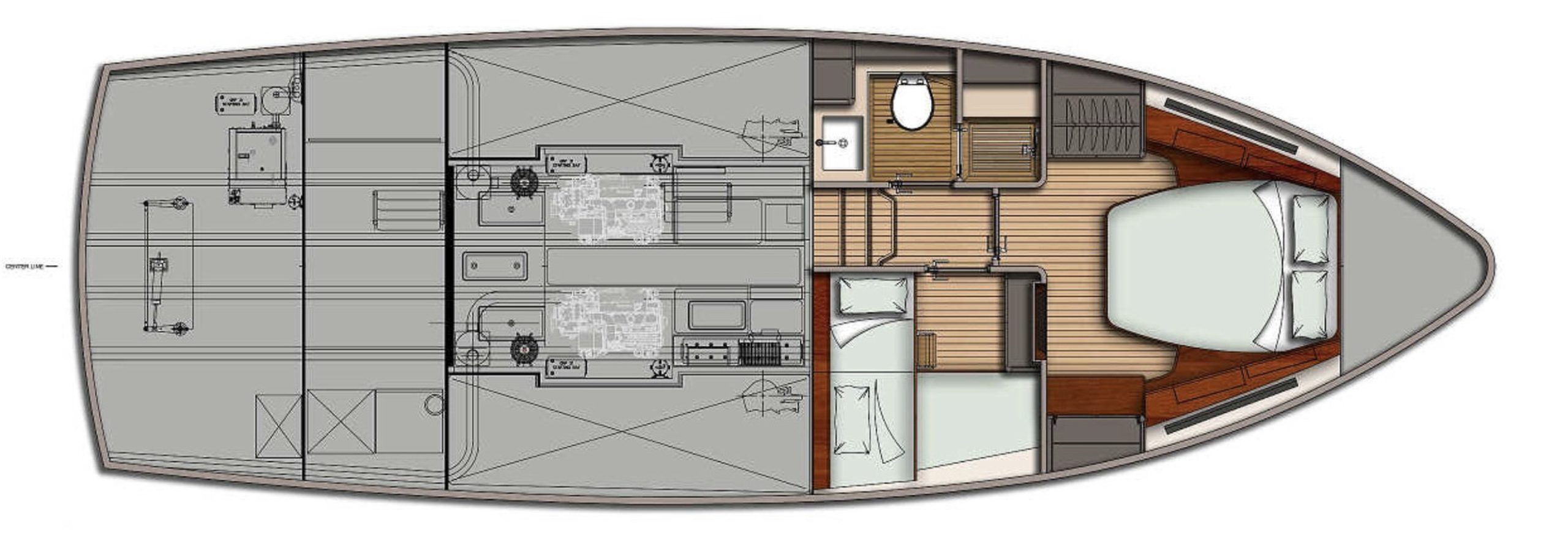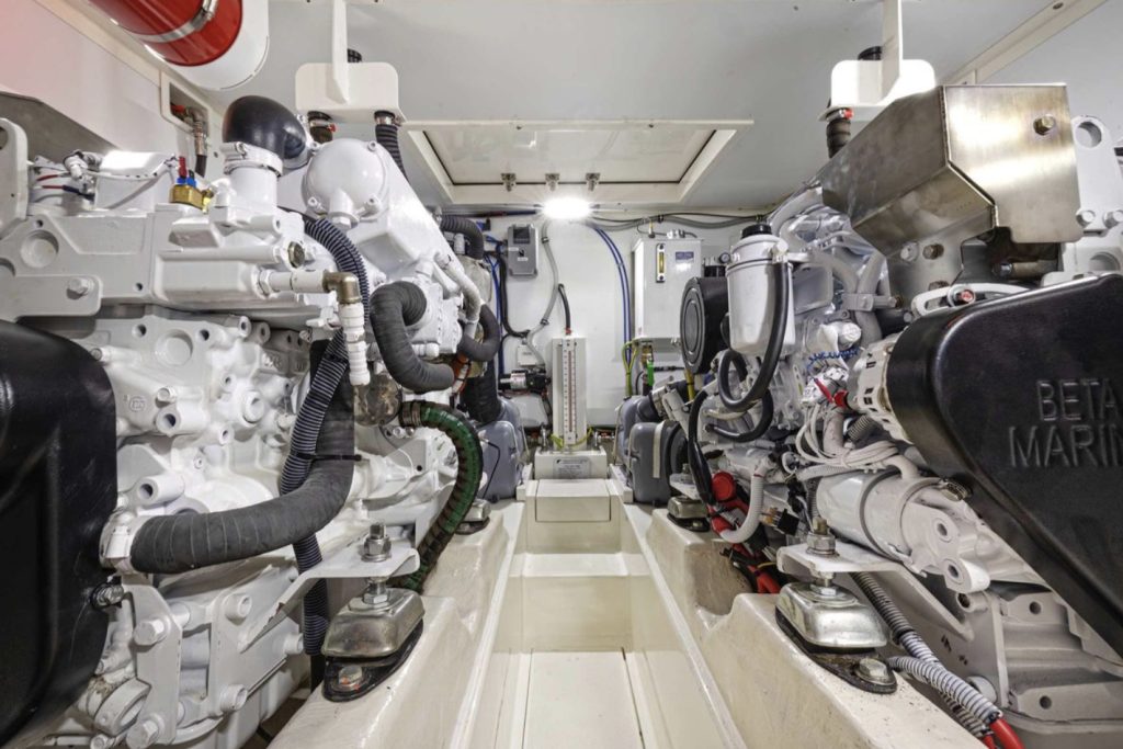 These engines routinely run over 20,000 hours in generator applications and are free of the electronic controls required by larger HP engines to meet ever-tightening environmental requirements. There is no CPU to fail, just a beautifully simple, mechanically injected – but very clean burning – diesel engine. Each engine is capable of pushing the yacht at cruising speed and with large reduction gears and propellers in the most desirable location possible.