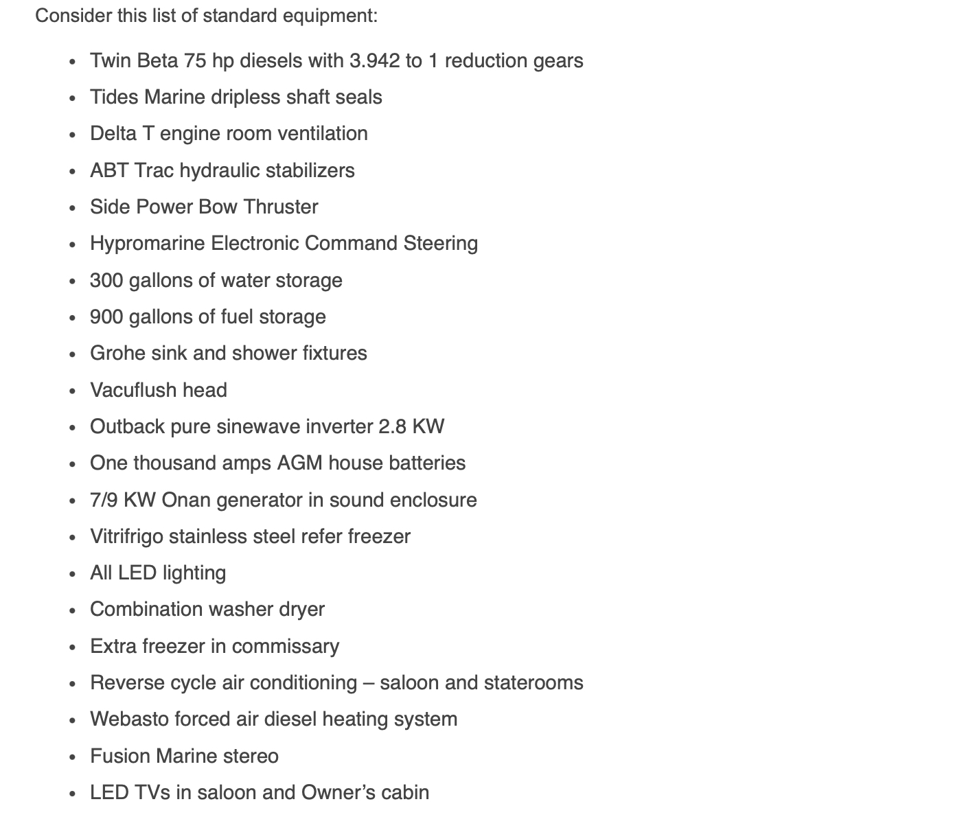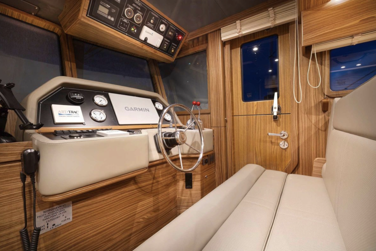 In order to really experience the amazing sea keeping qualities of a properly designed displacement hull, stabilizing is essential. We have selected the best available and our standard boat is equipped with ABT Trac 220 stabilizers with 6-sq-ft. fins. With her beautiful hull, low and purposeful profile and 4,000 pounds of lead ballast in her keel, this Nordhavn will provide an amazingly stable ride in the roughest of conditions.