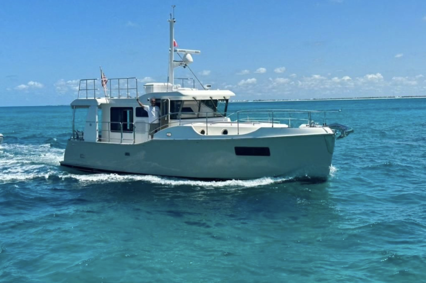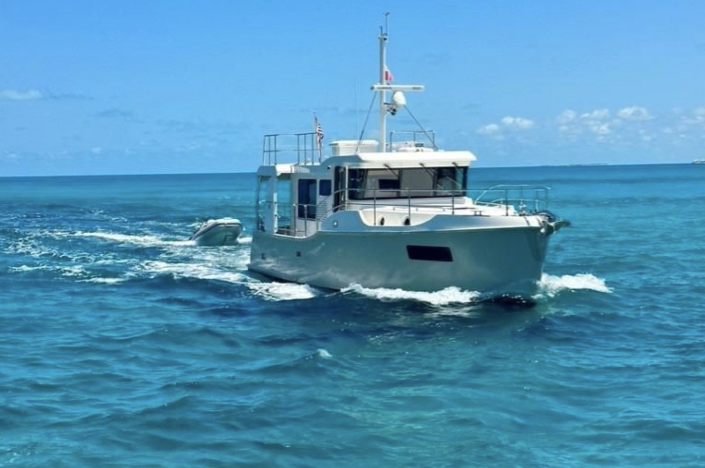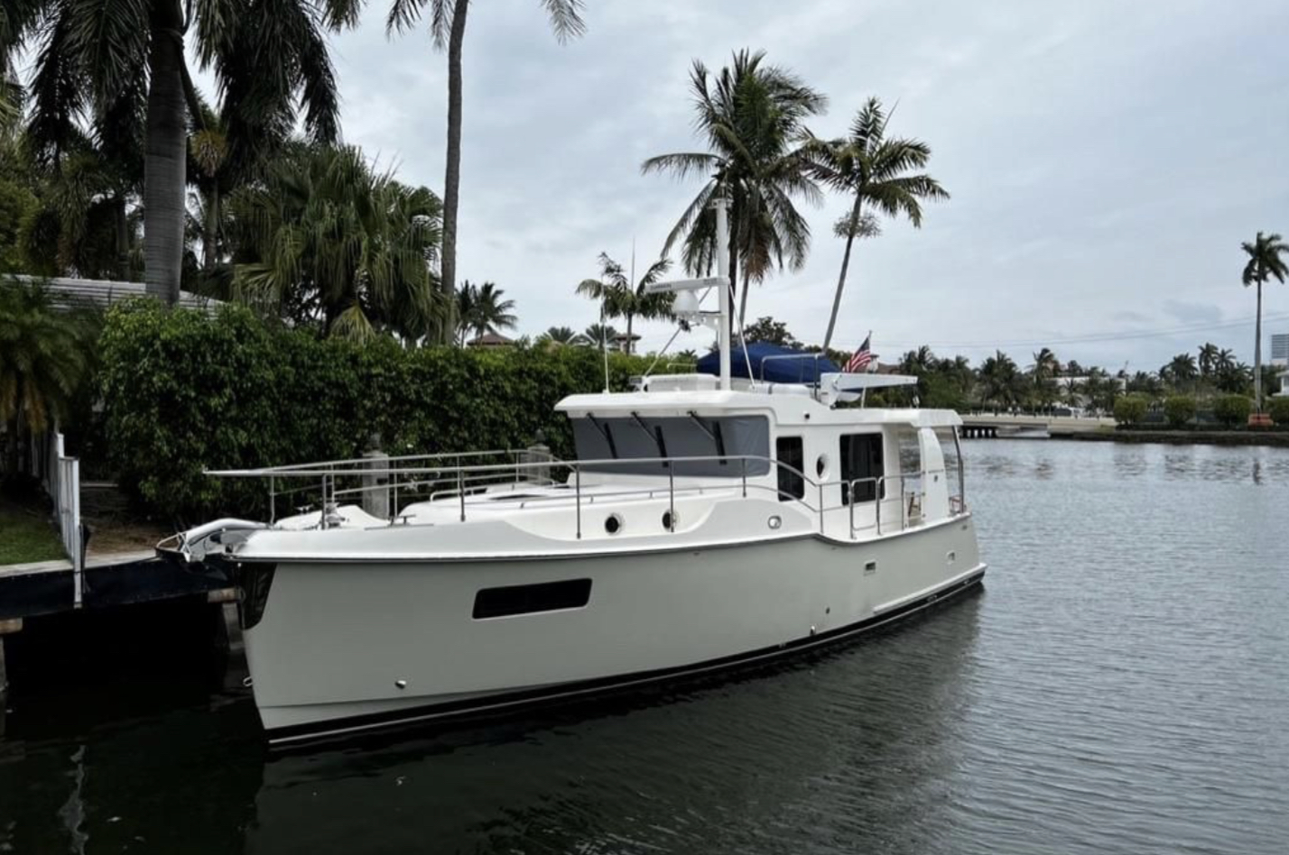 Designed with the sea and cruising in mind, the Nordhavn 41 profile is necessarily low resulting in a sleek, attractive look. Her double side decks allow easy movement topside during docking and mooring. A powerful 12-foot center console tender can be accommodated on deck and a beautiful 800-lb. davit is standard.