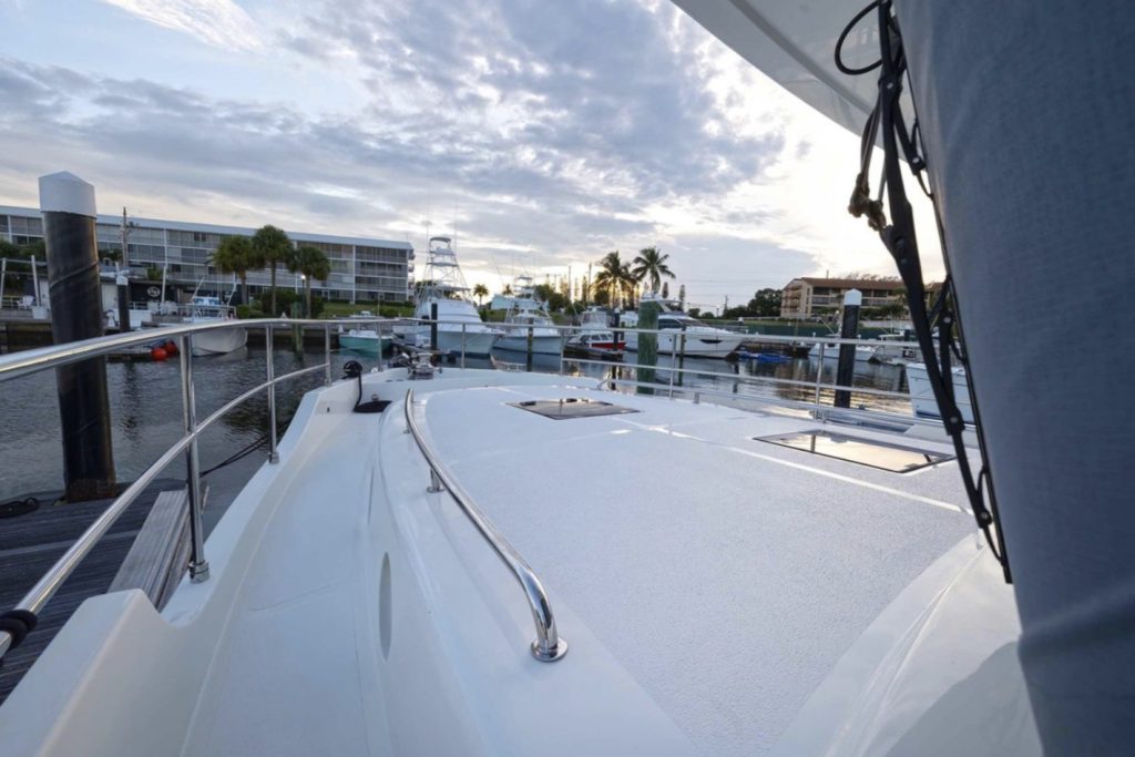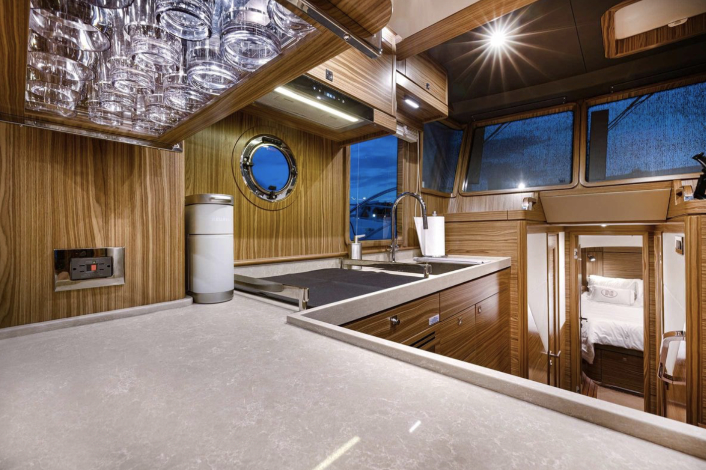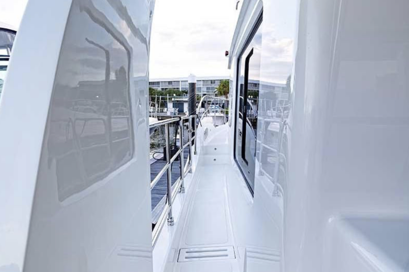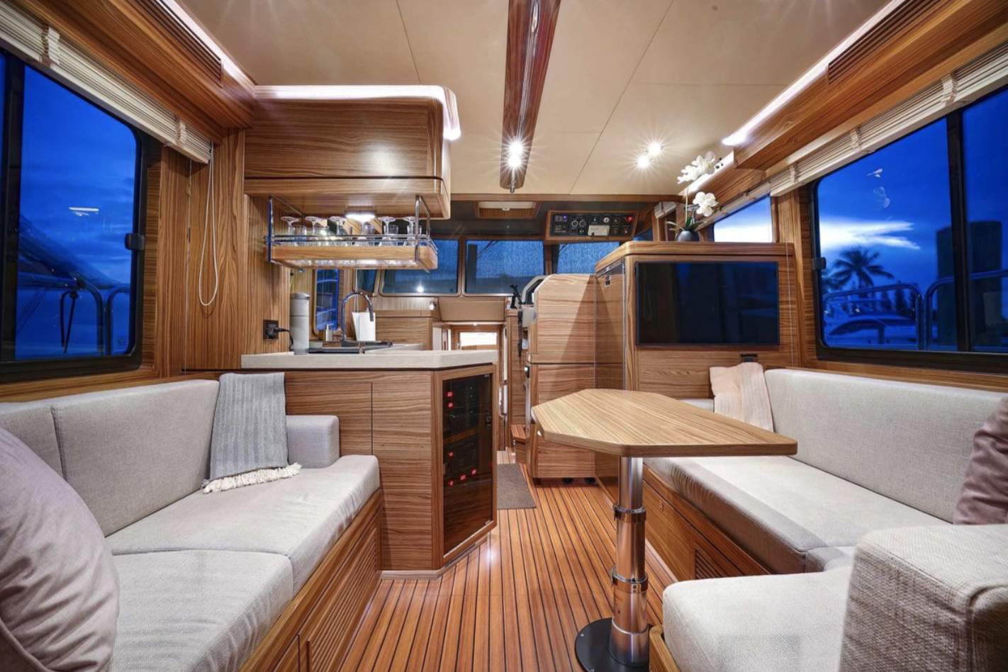 Designed with the sea and cruising in mind, the Nordhavn 41 profile is necessarily low resulting in a sleek, attractive look. Her double side decks allow easy movement topside during docking and mooring. A powerful 12-foot center console tender can be accommodated on deck and a beautiful 800-lb. davit is standard.
