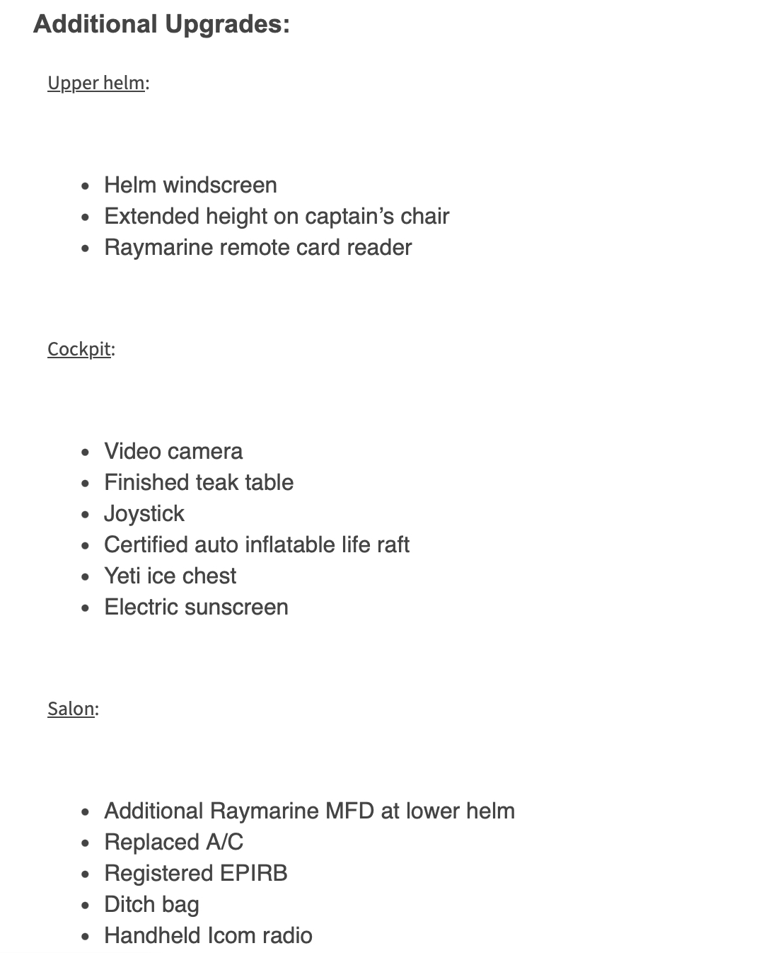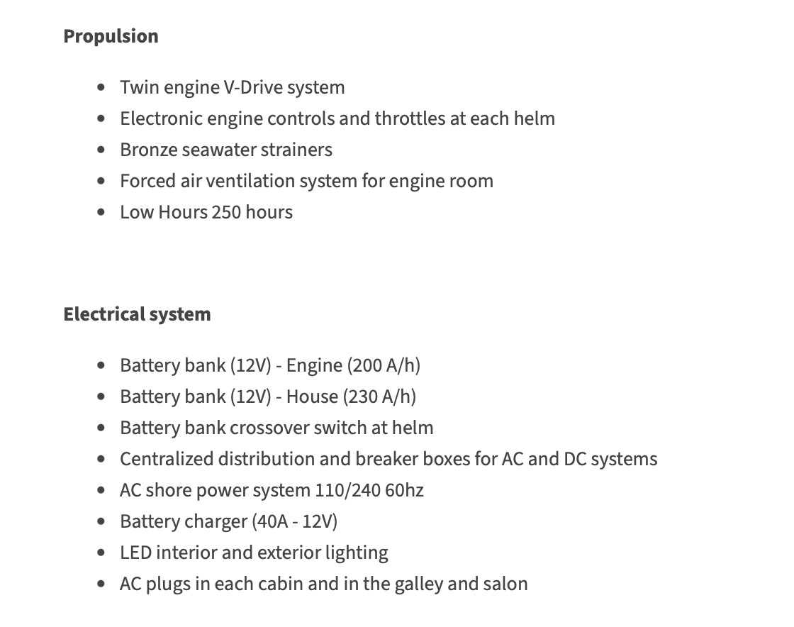 The boat presented on this page is for information purposes only and is not necessarily available for sale and/or rent. This boat is offered under reserve, availability to be verified. This document or this announcement is not contractual. The boat information displayed in the above results is presented in good faith and, while believed to be correct, is not guaranteed. Ita Yachts Canada Inc. and/or ProprioBateau does not offer warranty or assume any legal liability or responsibility for the accuracy, completeness, or usefulness of the information and/or images displayed, as they may not be current or may be images of a comparable boat. All boat information is subject to change without notice and is without warranty. This boat may be offered by another broker open to co-brokerage.