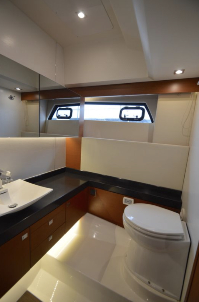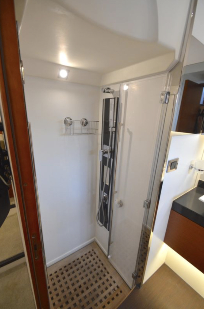 A lower station makes piloting on hot days an air conditioned pleasure or in foul weather the ultimate protected spot for the captain. Outside a large flybridge offers a sunpad (in addition to the one on the bow!), a full upper helm station, a grill and wetbar, refrigerated drink box, ample seating and a custom corian table to match the one found on the covered aft deck. On top of all this, there is a single berth crew’s cabin with full a/c and heat, plenty of natural light and its own head!
