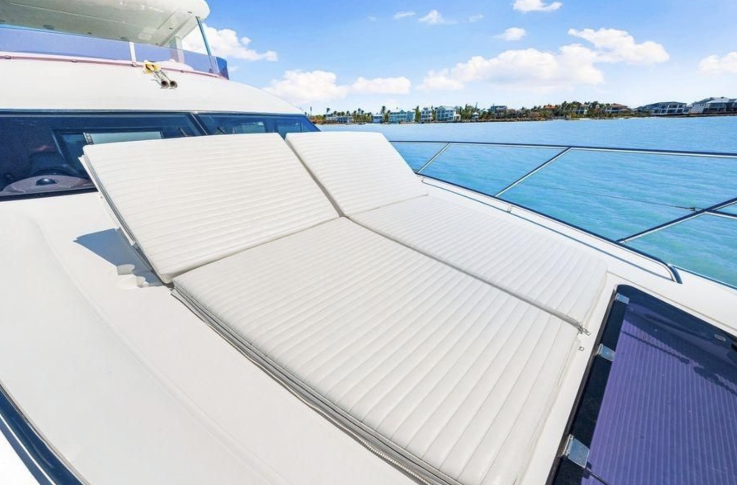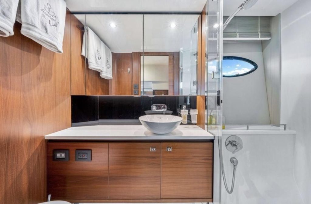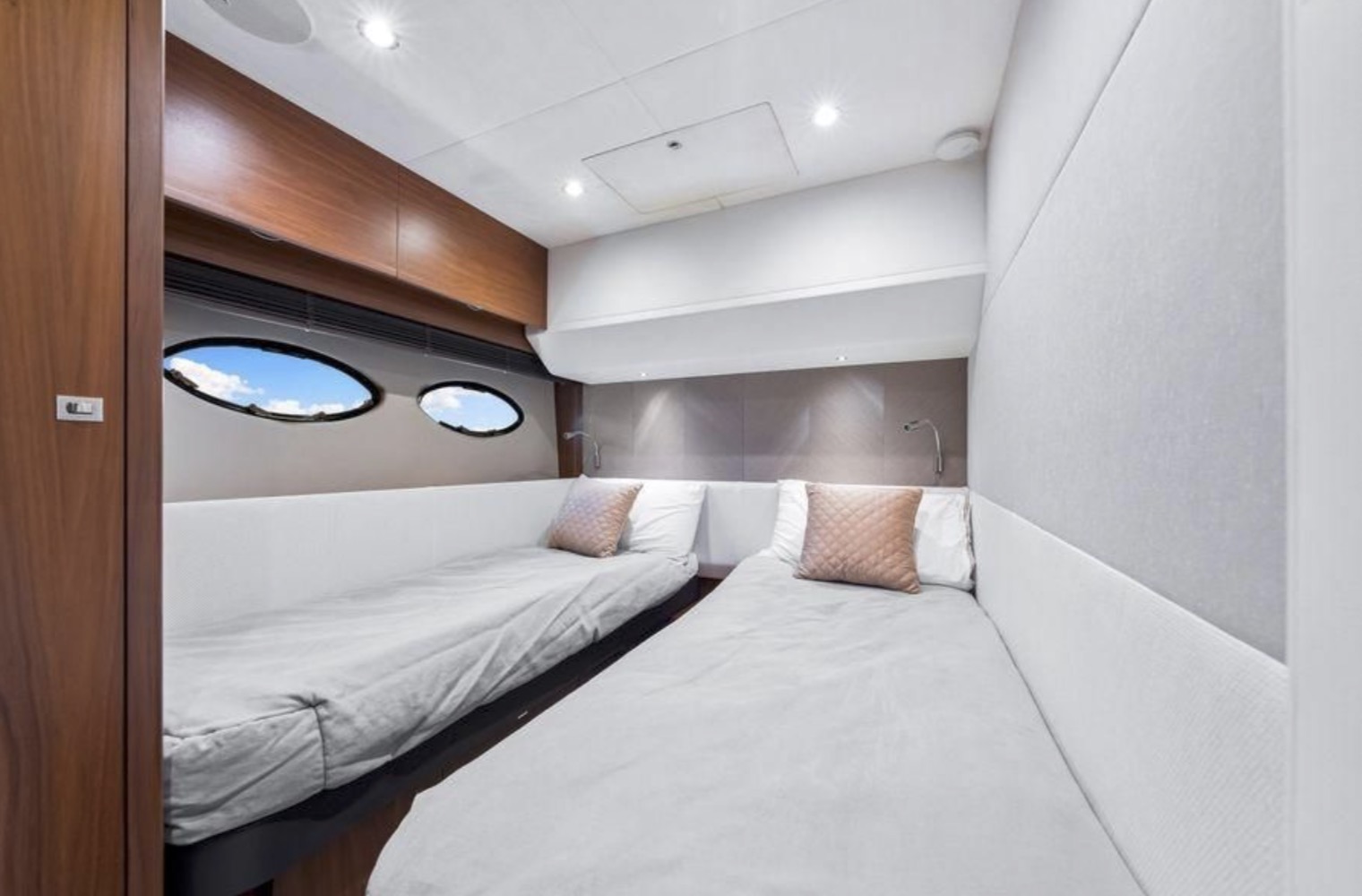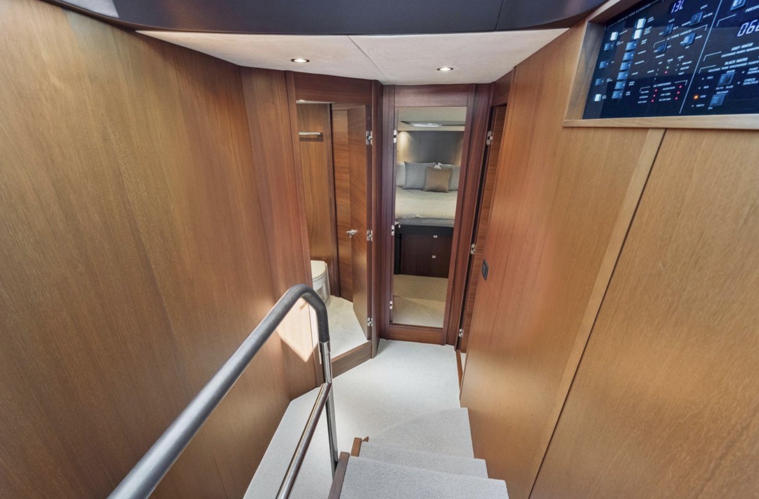 Below, generous headroom and intelligent layout planning provide three beautifully appointed cabins, including a full-beam owner’s suite, delivering the comfort, privacy, and volume expected of a yacht in this class.