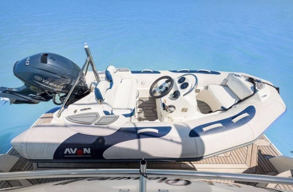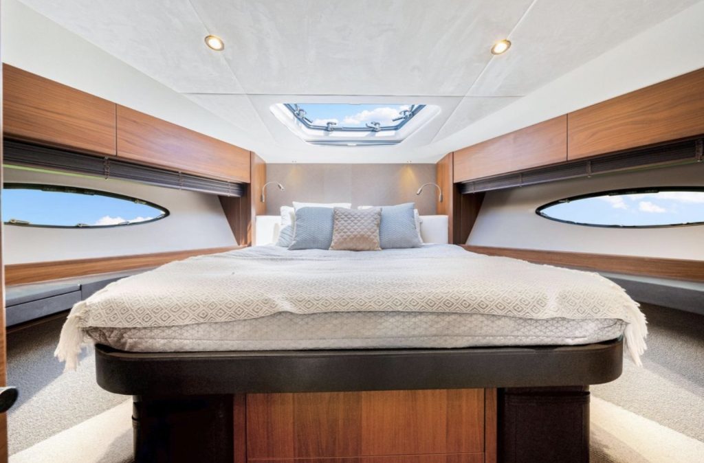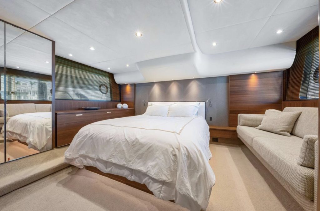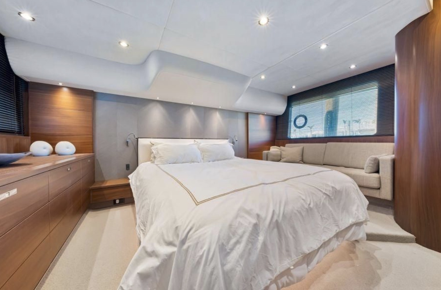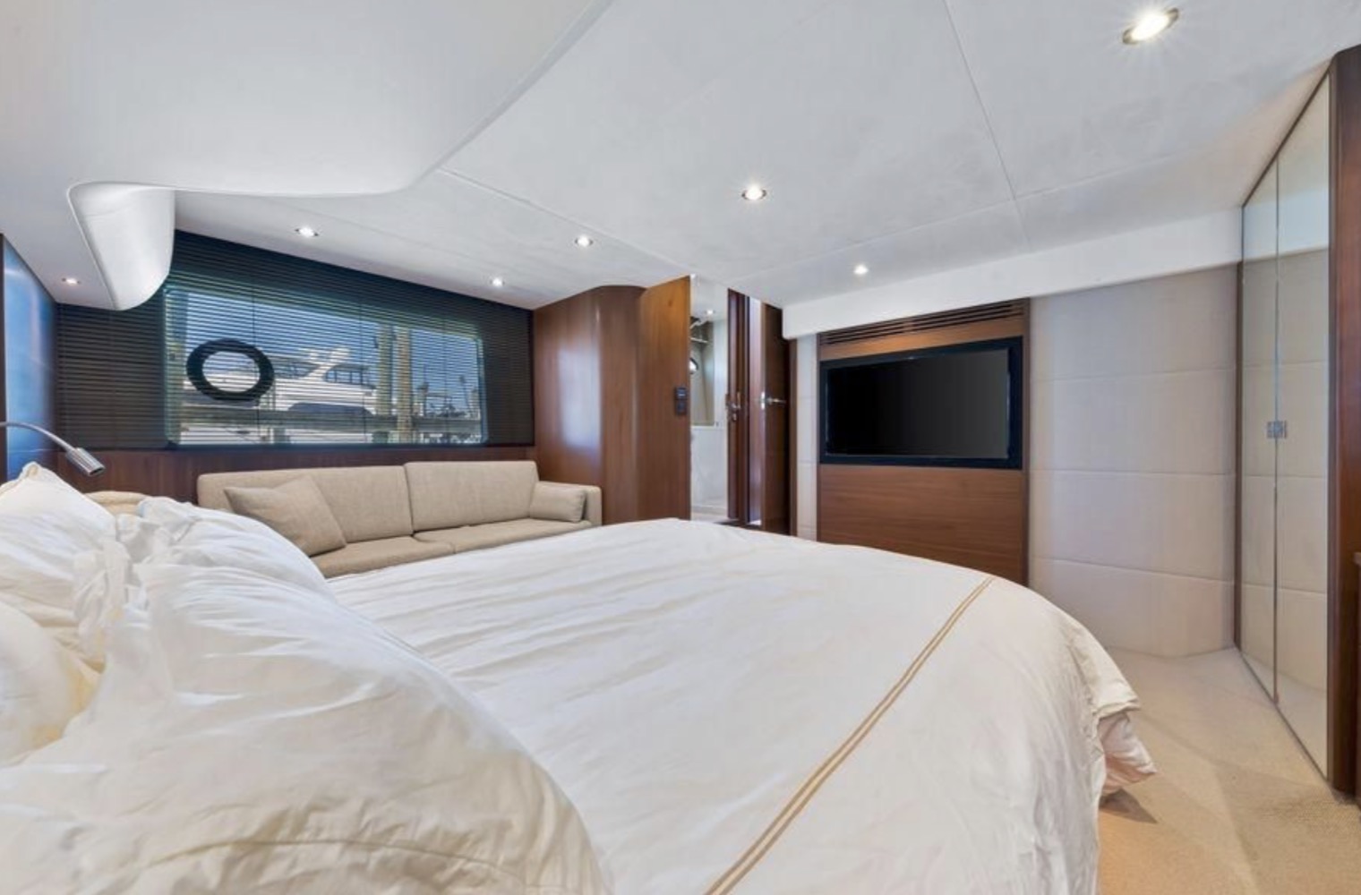 Below, generous headroom and intelligent layout planning provide three beautifully appointed cabins, including a full-beam owner’s suite, delivering the comfort, privacy, and volume expected of a yacht in this class.