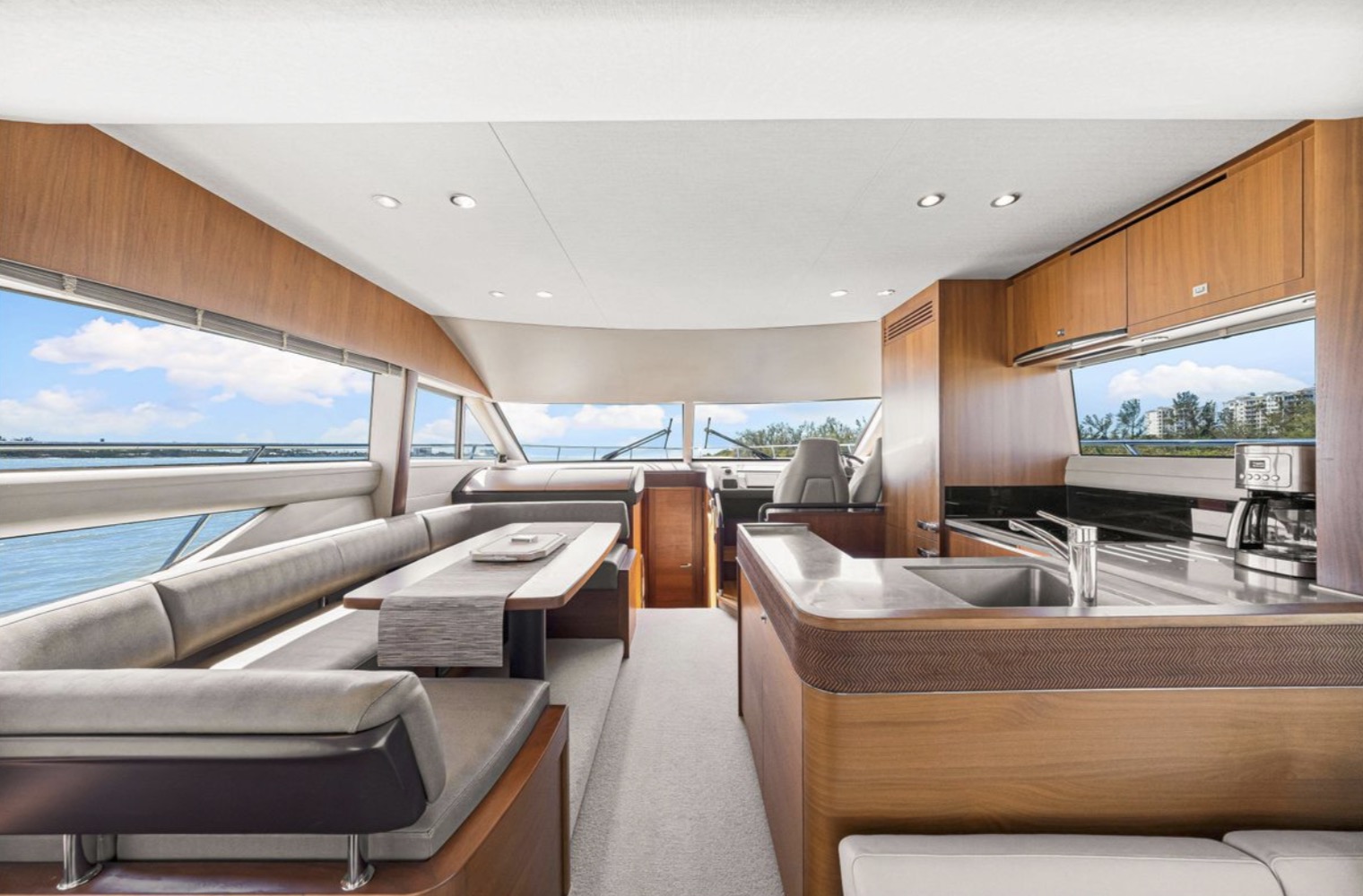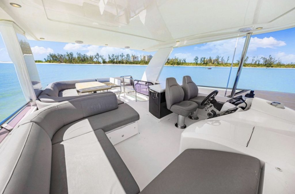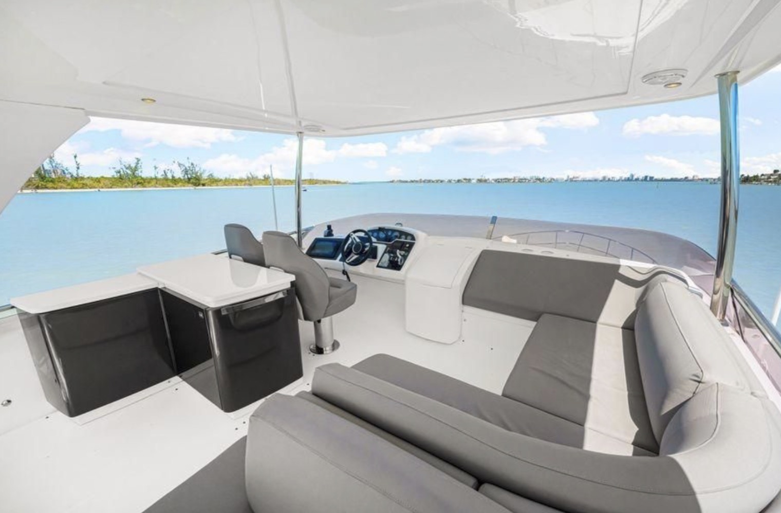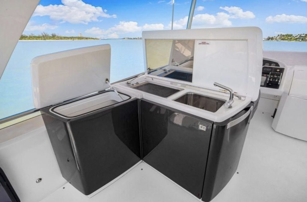 From the teak-laid decks to the expansive flybridge entertaining space, every area aboard is designed for both relaxation and functionality. The upper deck features versatile lounge seating, sunpad conversion, grill station, and helm seating for commanding visibility underway, while the main deck helm and adjacent galley create a natural social hub for cruising and entertaining.