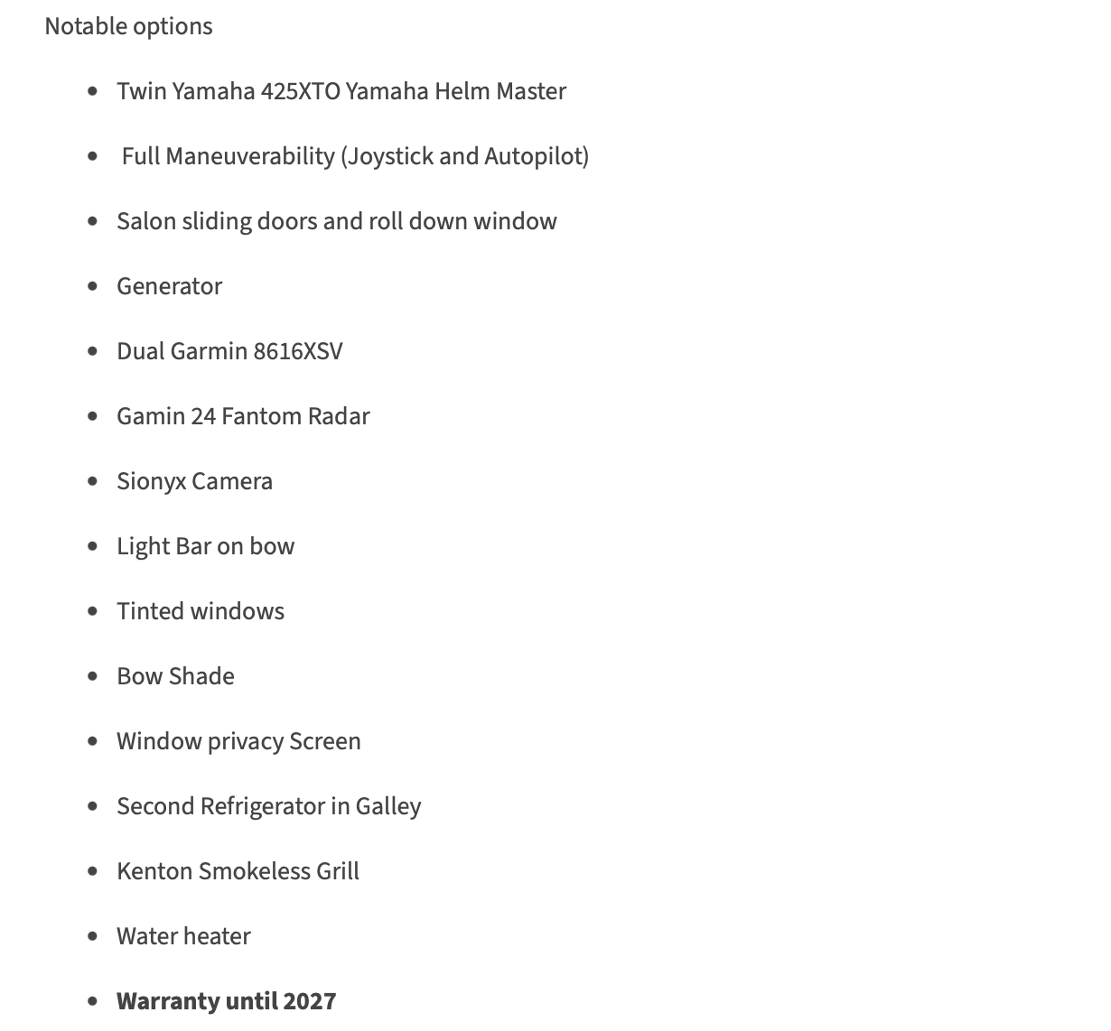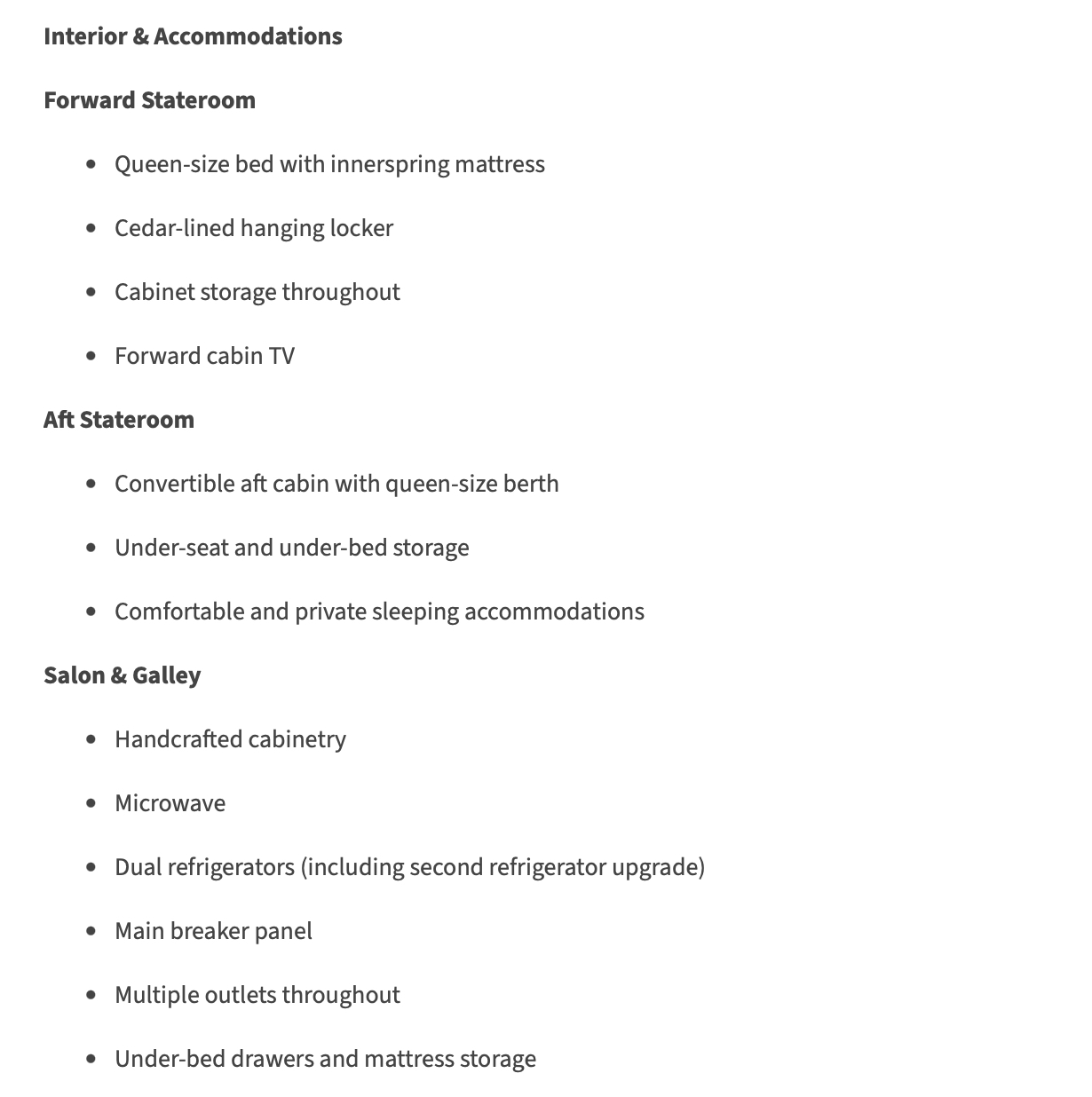 The boat presented on this page is for information purposes only and is not necessarily available for sale and/or rent. This boat is offered under reserve, availability to be verified. This document or this announcement is not contractual. The boat information displayed in the above results is presented in good faith and, while believed to be correct, is not guaranteed. Ita Yachts Canada Inc. and/or ProprioBateau does not offer warranty or assume any legal liability or responsibility for the accuracy, completeness, or usefulness of the information and/or images displayed, as they may not be current or may be images of a comparable boat. All boat information is subject to change without notice and is without warranty. This boat may be offered by another broker open to co-brokerage.