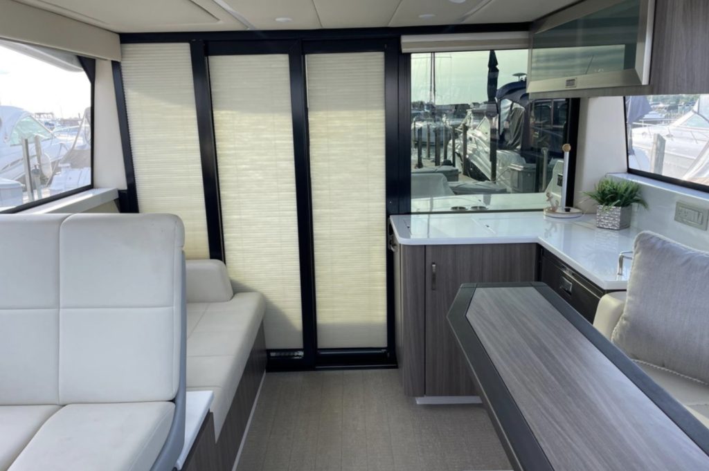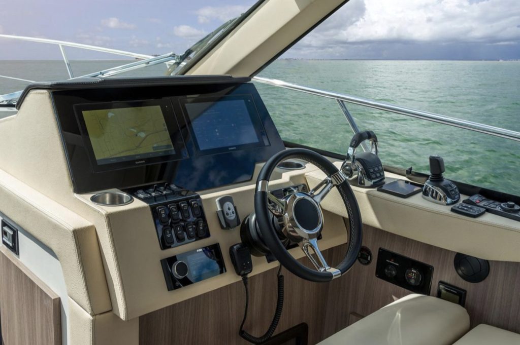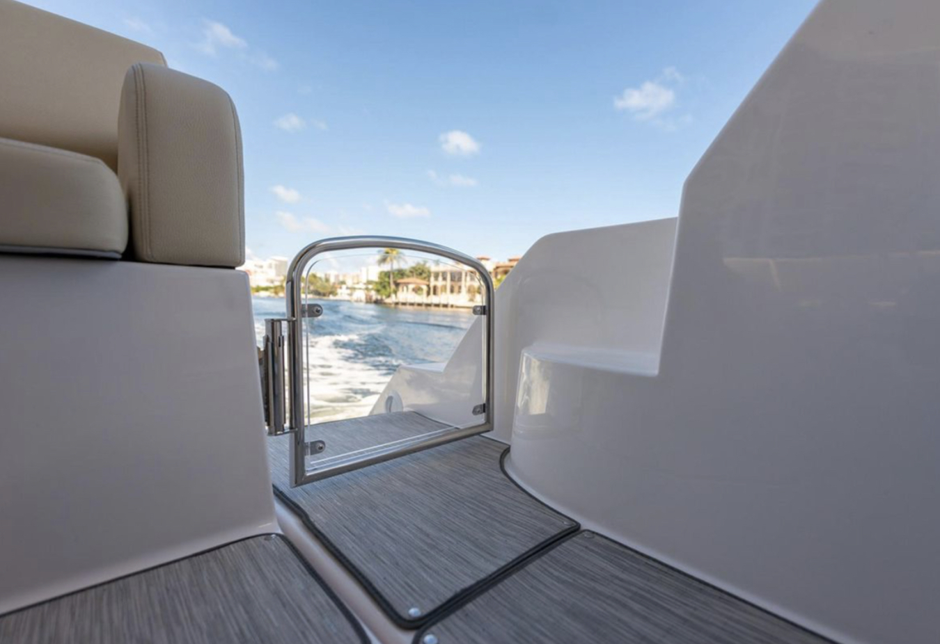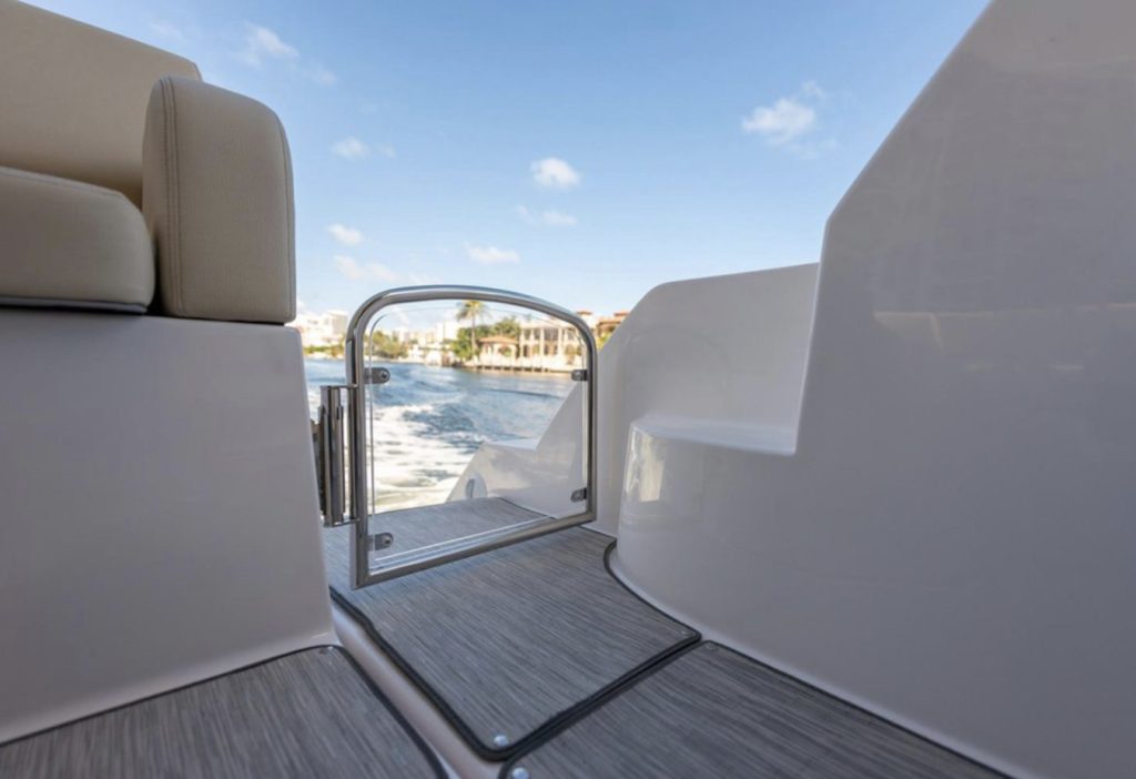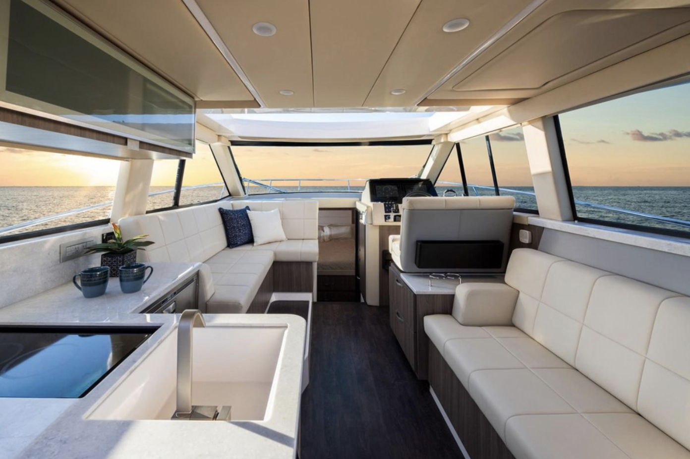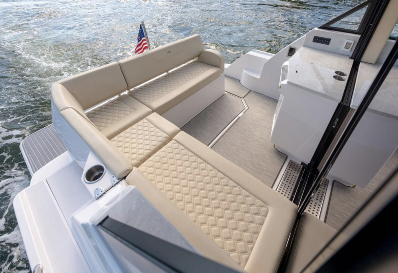 Step aboard and experience unmatched comfort and versatility. The open cockpit flows seamlessly into the salon, creating a single expansive living space. With the push of a button, the power window lowers and sliding enclosure doors disappear, blending the indoors with the outdoors for a premium on-the-water experience.