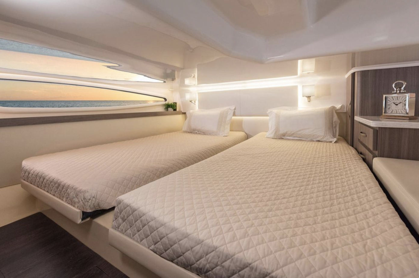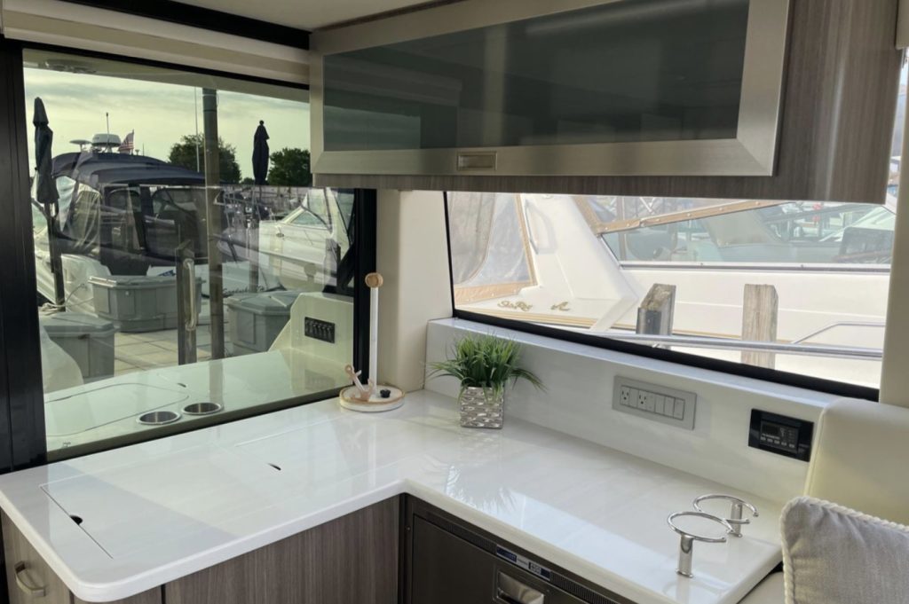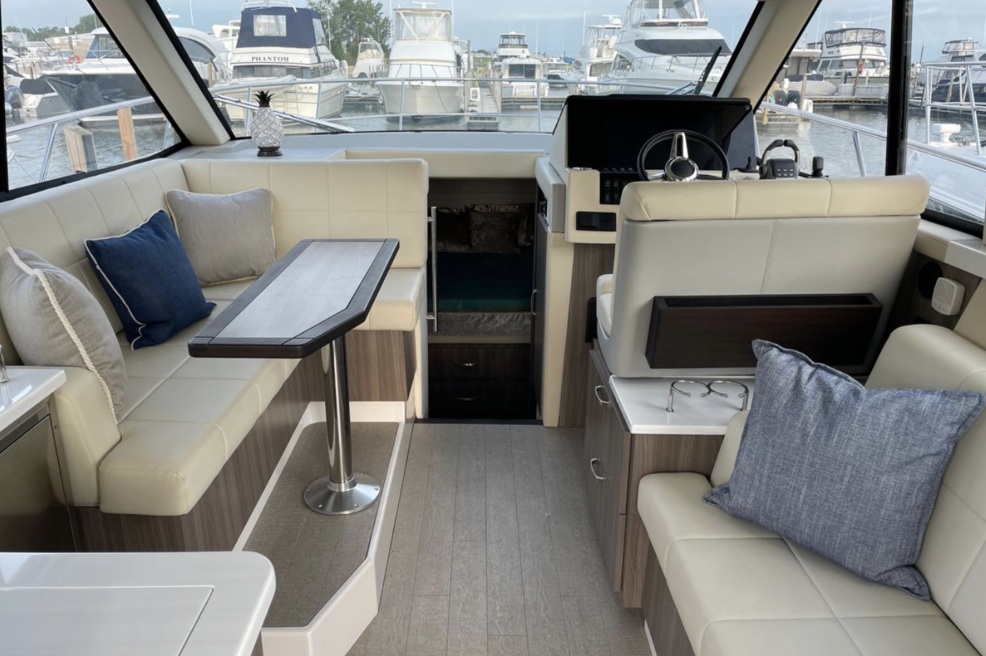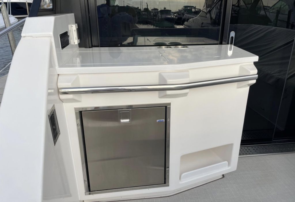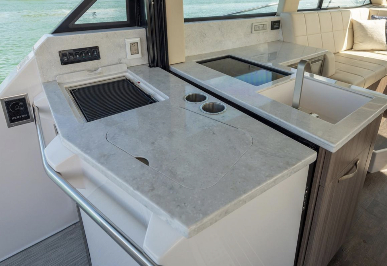 Step aboard and experience unmatched comfort and versatility. The open cockpit flows seamlessly into the salon, creating a single expansive living space. With the push of a button, the power window lowers and sliding enclosure doors disappear, blending the indoors with the outdoors for a premium on-the-water experience.