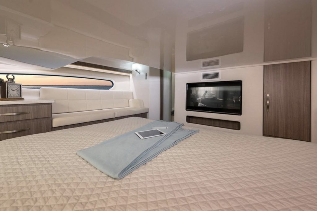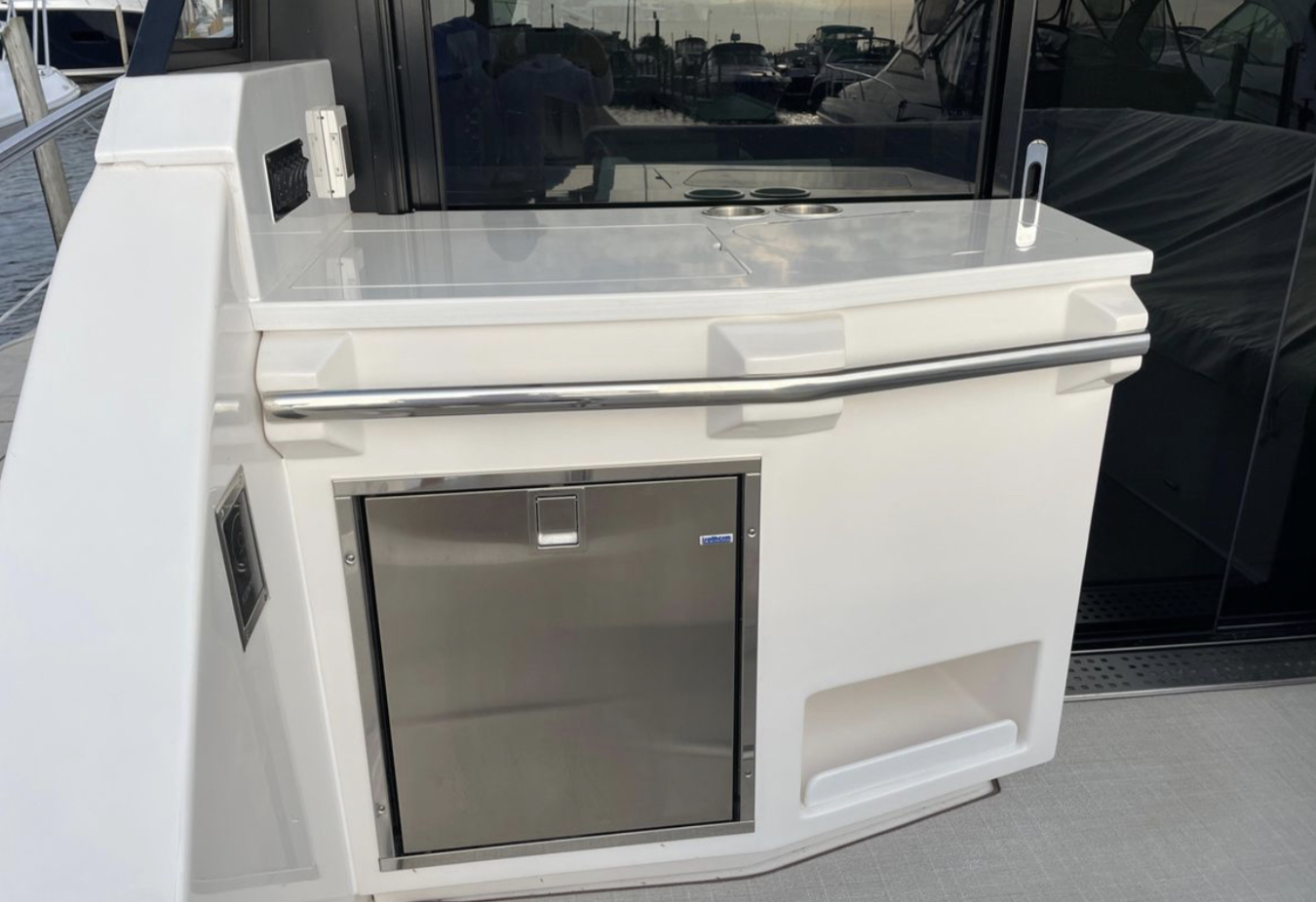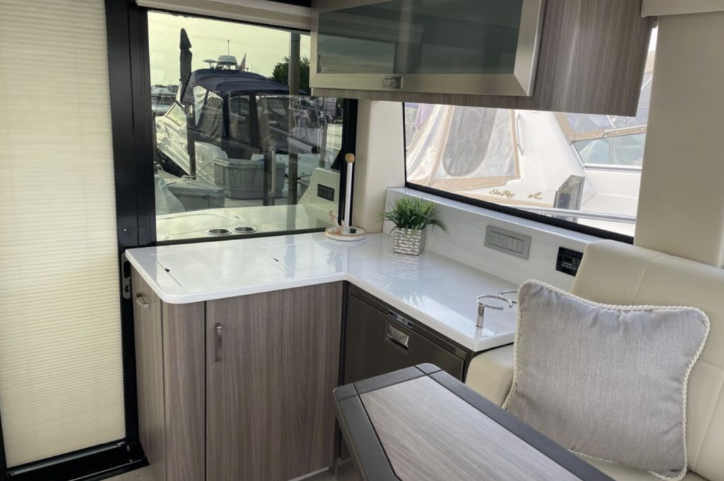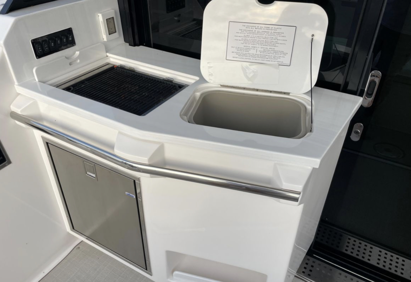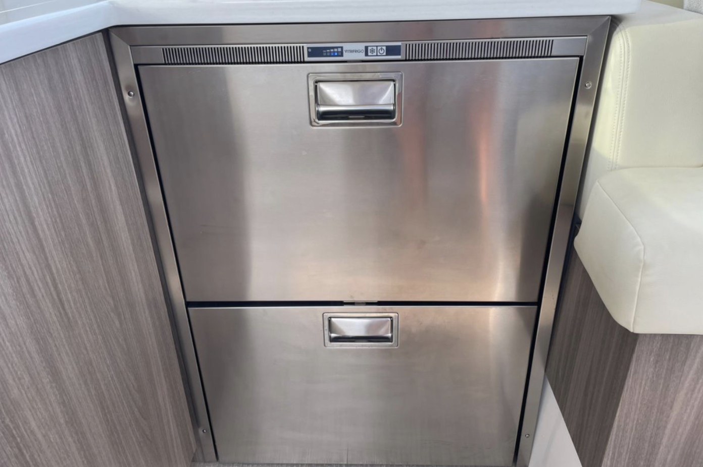 Step aboard and experience unmatched comfort and versatility. The open cockpit flows seamlessly into the salon, creating a single expansive living space. With the push of a button, the power window lowers and sliding enclosure doors disappear, blending the indoors with the outdoors for a premium on-the-water experience.