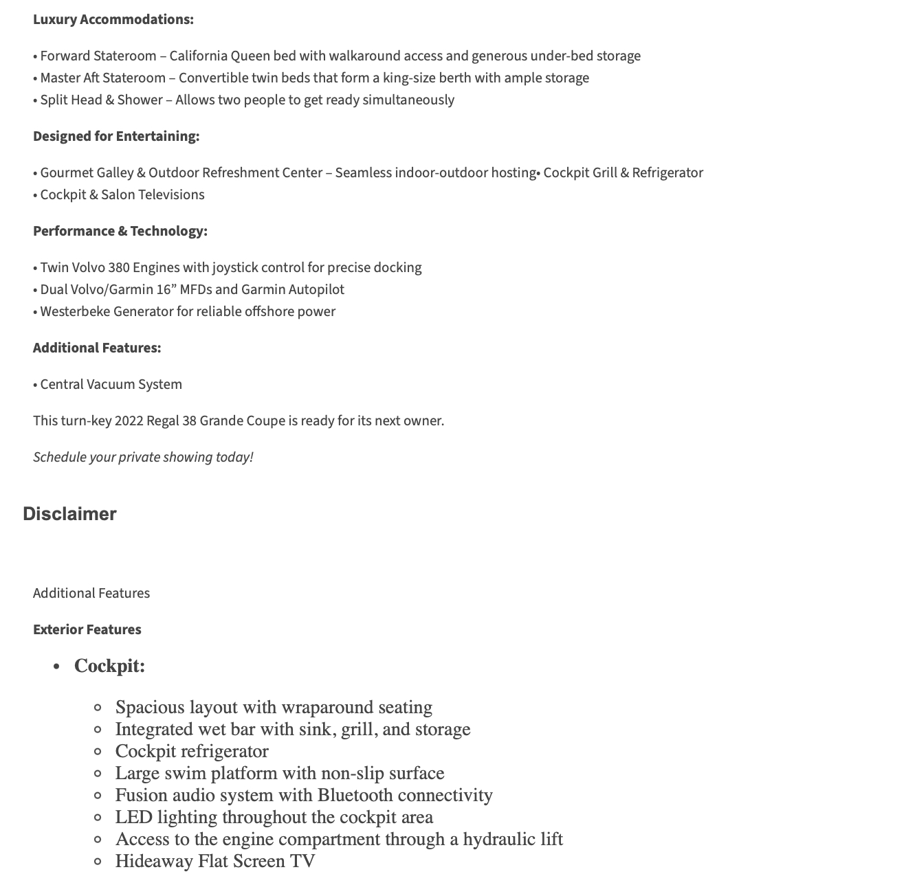 Always kept in freshwater, this one-owner 2022 Regal 38 Grande Coupe has been meticulously maintained. With only 40 hours on its Twin Volvo 380 engines and 30 hours on its Westerbeke Generator, this yacht is designed for entertaining, relaxing, and making memories on the water.