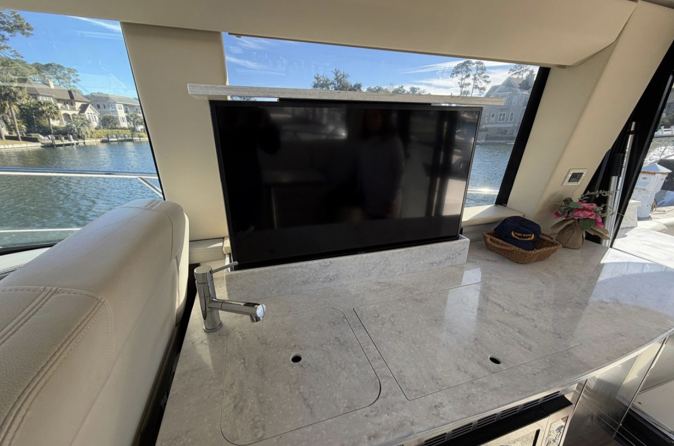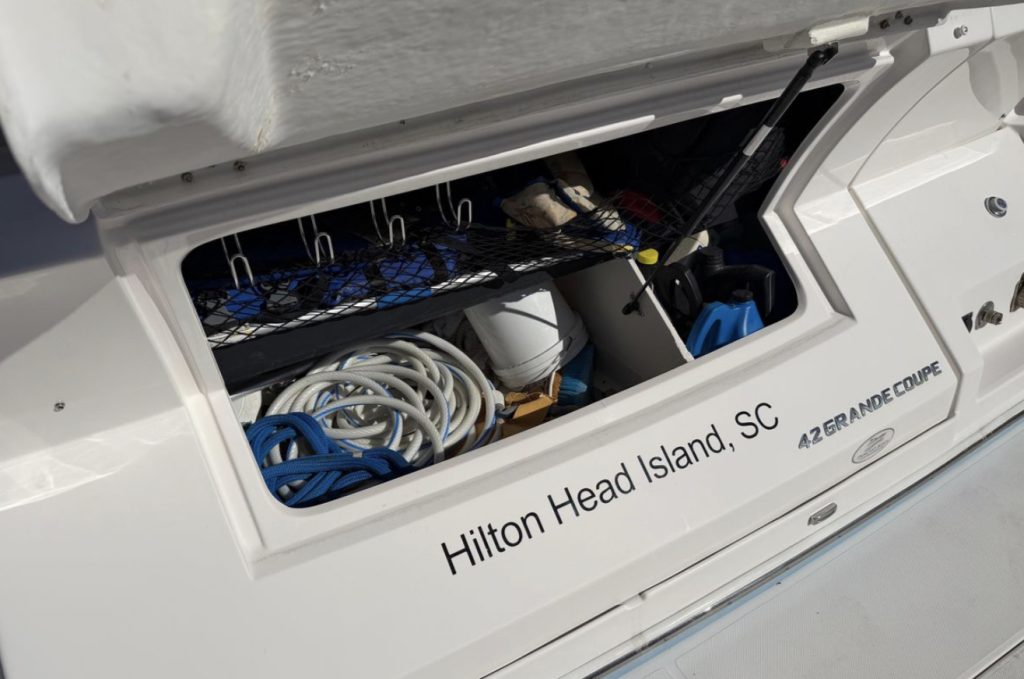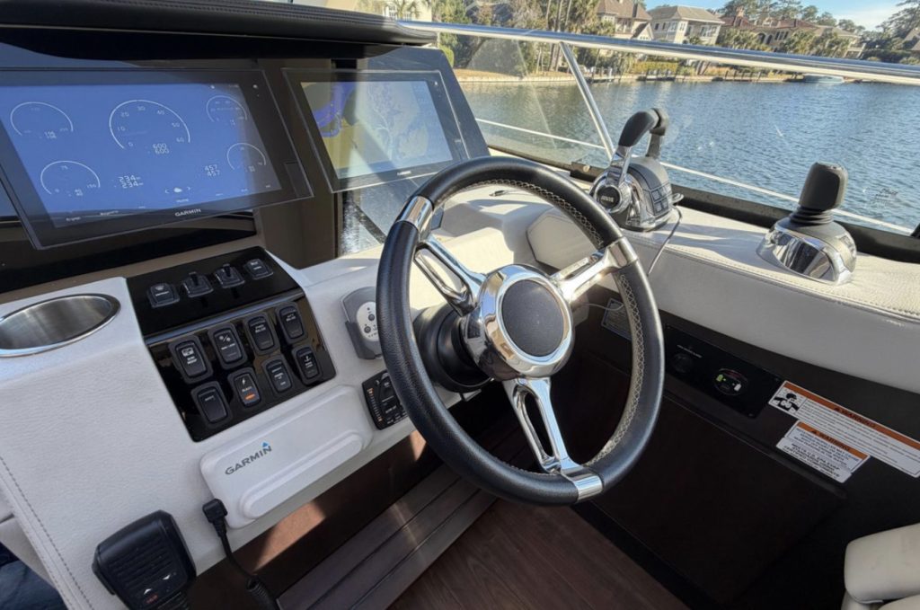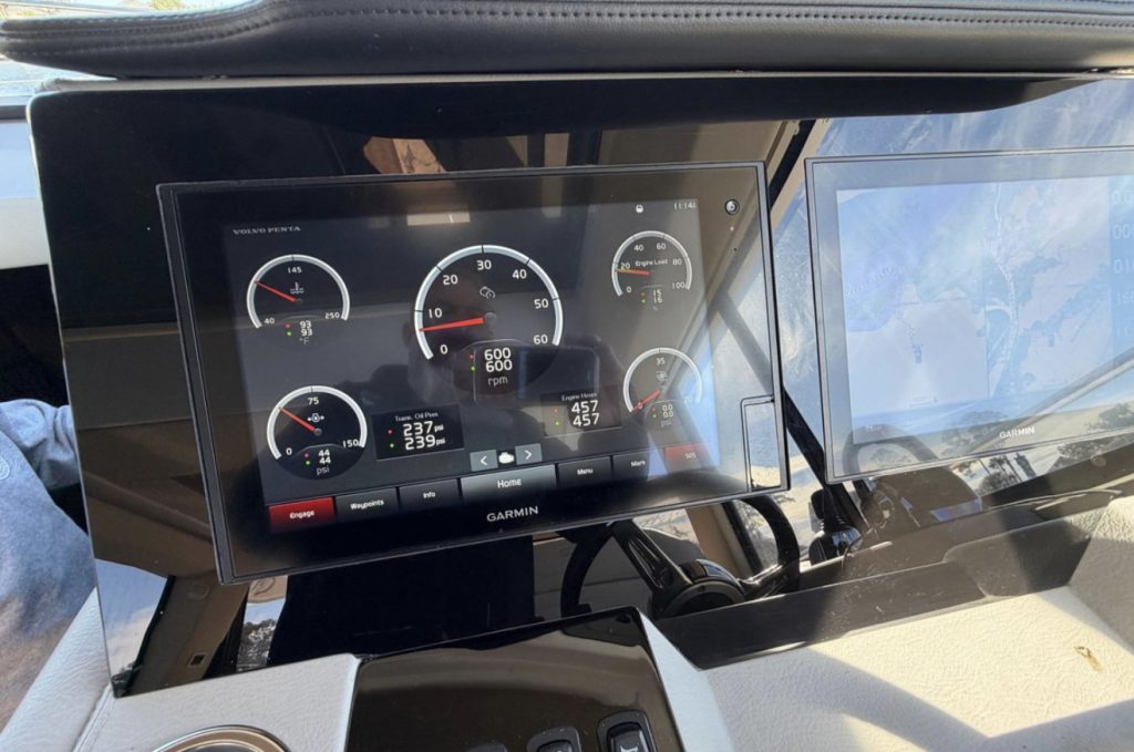 Aft Teak Cockpit Table, Central Vacuum, Dual Garmin 12″ Glass Cockpit, Fender Clips, Refreshment Center w/Aft Privacy Door, Satellite Marine Weather and Stereo, Garmin Clsoed Array Radar, Palm Beach Aft Enclosure, Power Platform, KVH Sat TV, Overboard Discharge and Salon Table w/Filler Cushions. Additionally, the boat has been equipped with an AC water flush kit, aft seat covers and a Garmin Personal Locator Beacon.