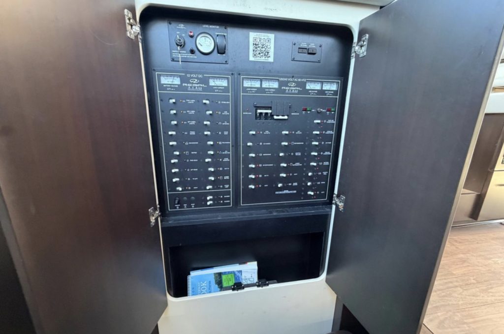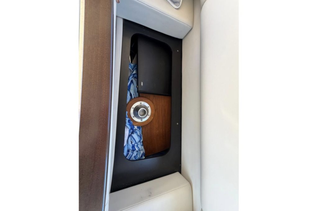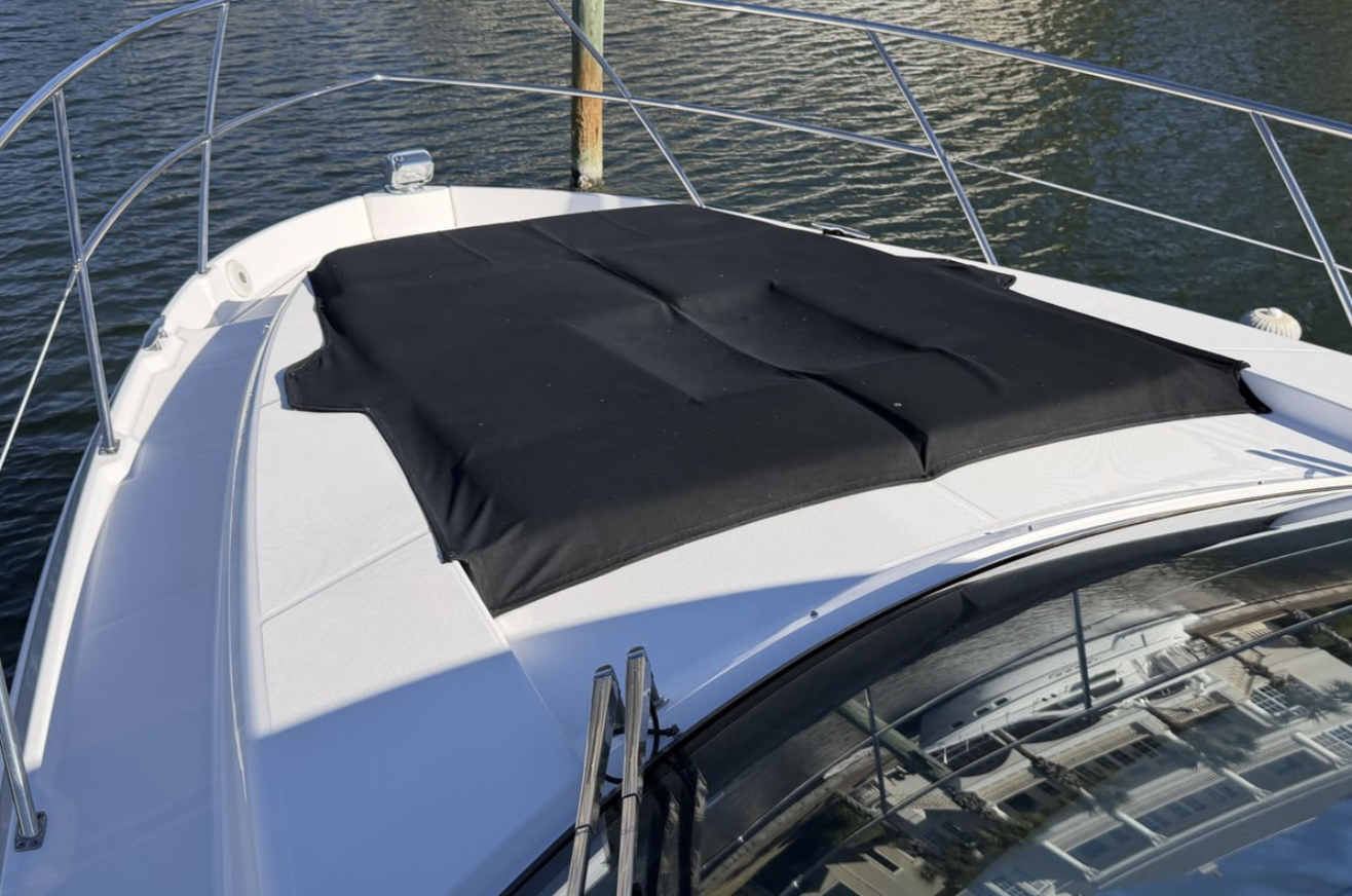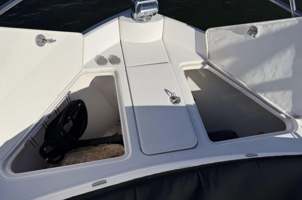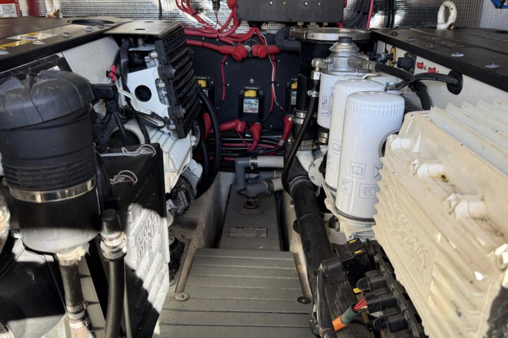 Aft Teak Cockpit Table, Central Vacuum, Dual Garmin 12″ Glass Cockpit, Fender Clips, Refreshment Center w/Aft Privacy Door, Satellite Marine Weather and Stereo, Garmin Clsoed Array Radar, Palm Beach Aft Enclosure, Power Platform, KVH Sat TV, Overboard Discharge and Salon Table w/Filler Cushions. Additionally, the boat has been equipped with an AC water flush kit, aft seat covers and a Garmin Personal Locator Beacon.