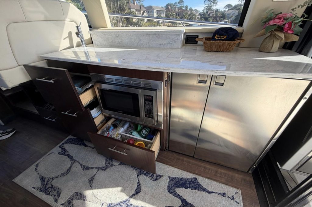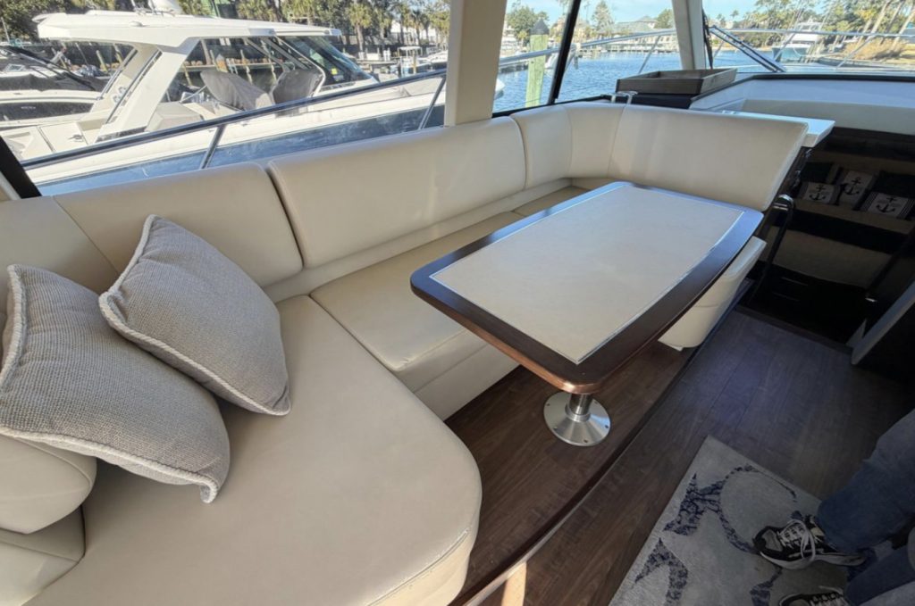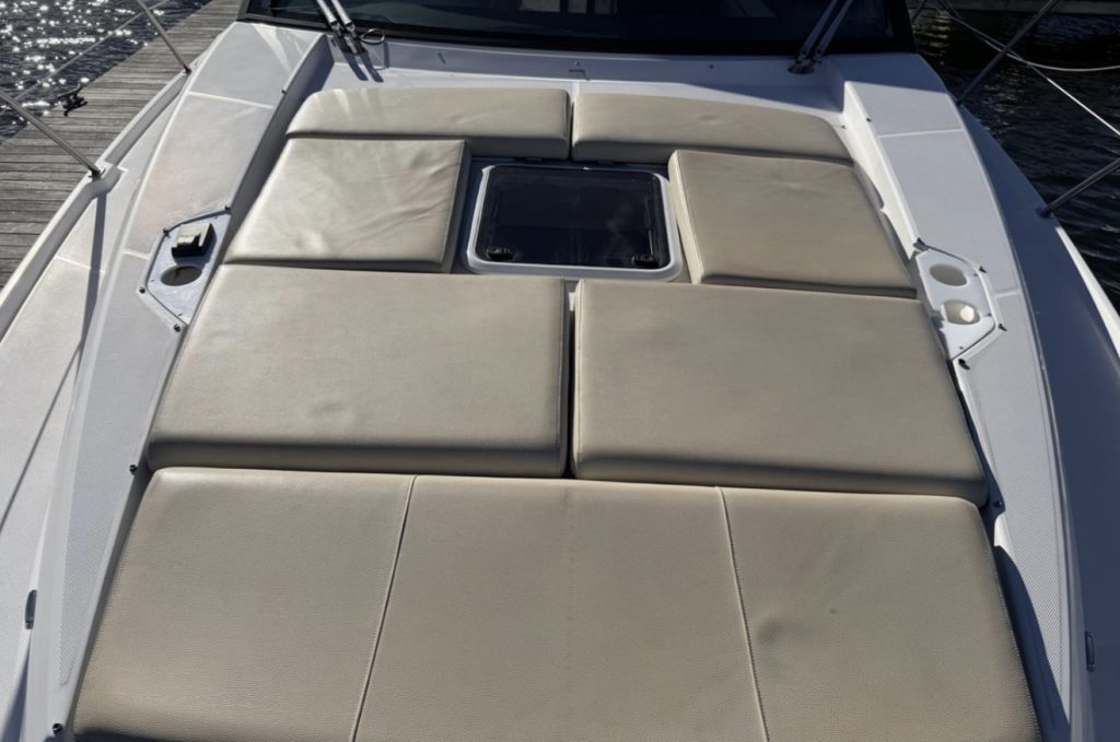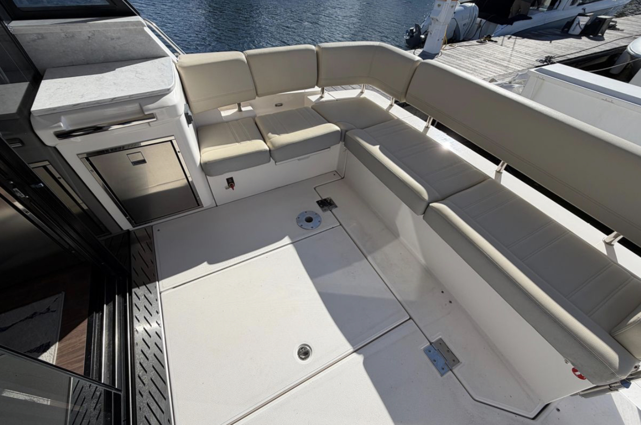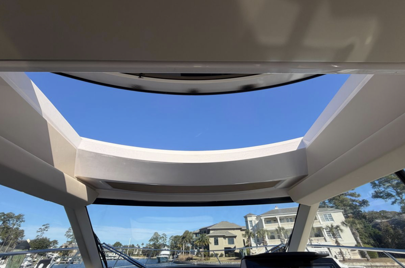 This boat has the refreshment center option downstairs in the cabin. Up in the salon, the galley up design lends itself to a great social setting. With three AC/Heat systems, you can ensure everyone’s comfort. Want to feel the breeze? Open the sunroof and the aft glass doors and windows. For more sun, check out the bow seating with easy access down both sides of the boat.