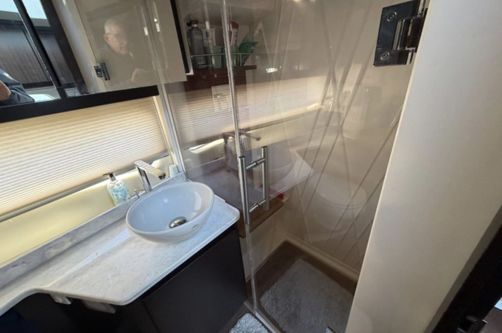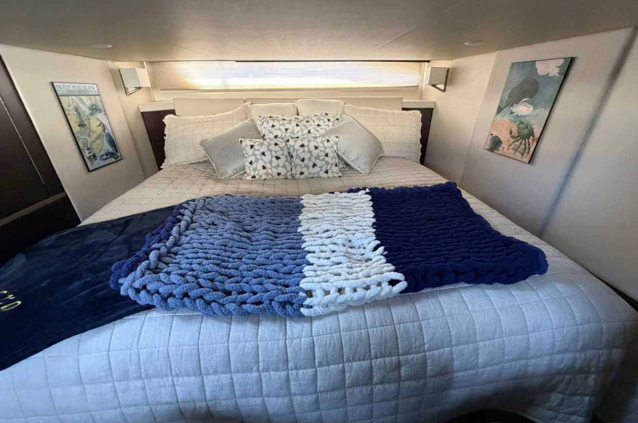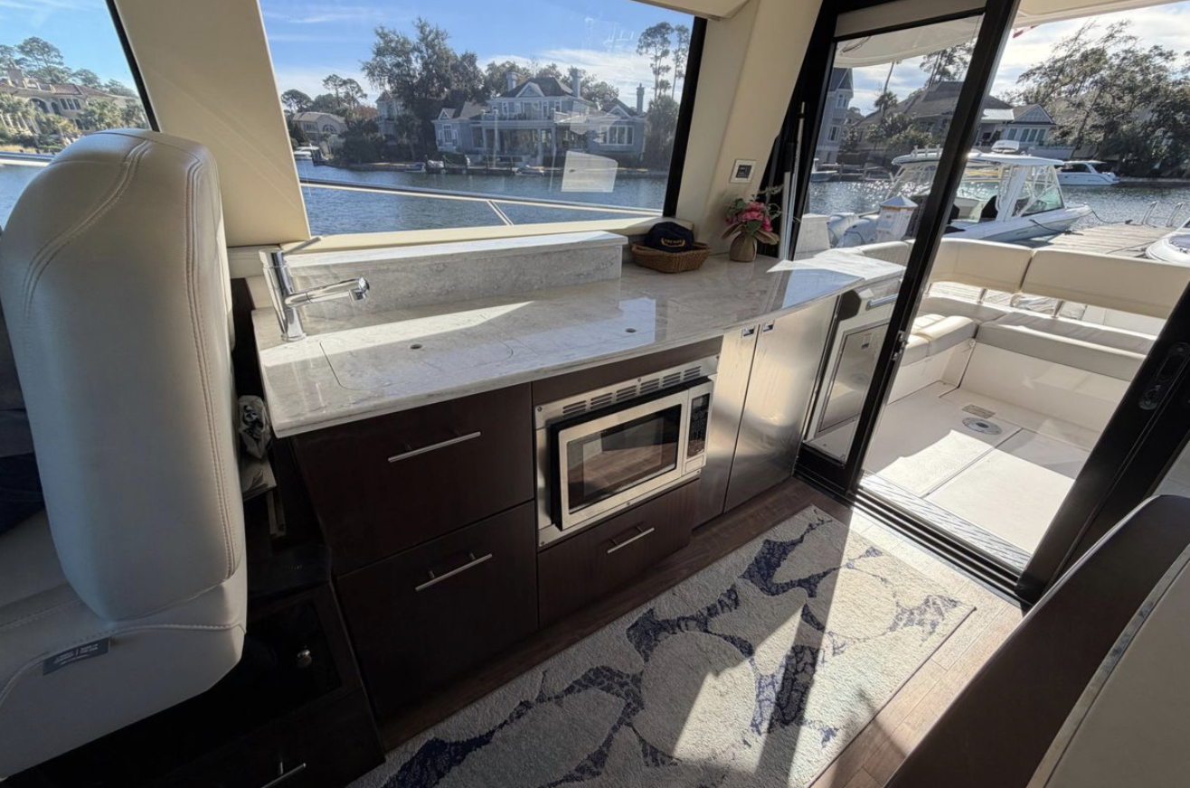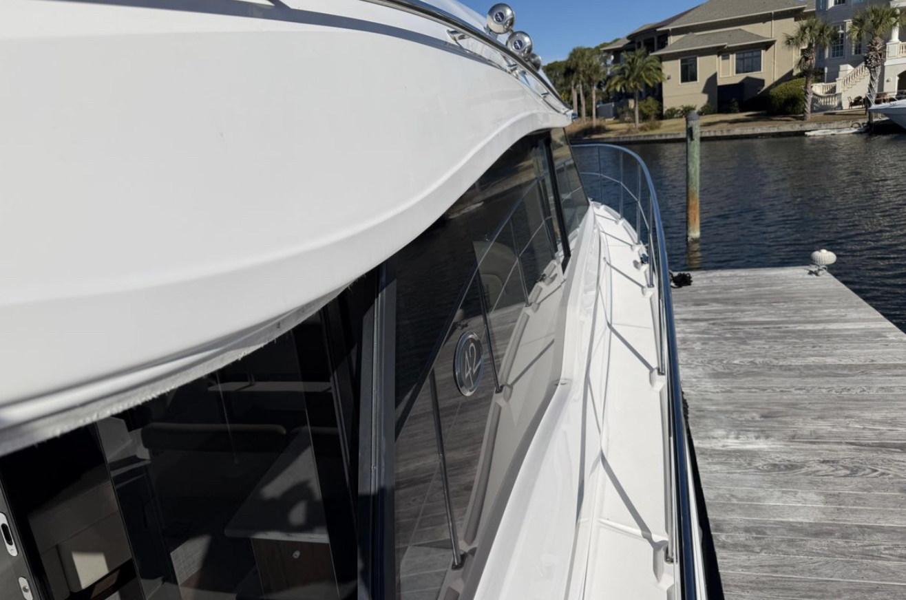 This boat has the refreshment center option downstairs in the cabin. Up in the salon, the galley up design lends itself to a great social setting. With three AC/Heat systems, you can ensure everyone’s comfort. Want to feel the breeze? Open the sunroof and the aft glass doors and windows. For more sun, check out the bow seating with easy access down both sides of the boat.