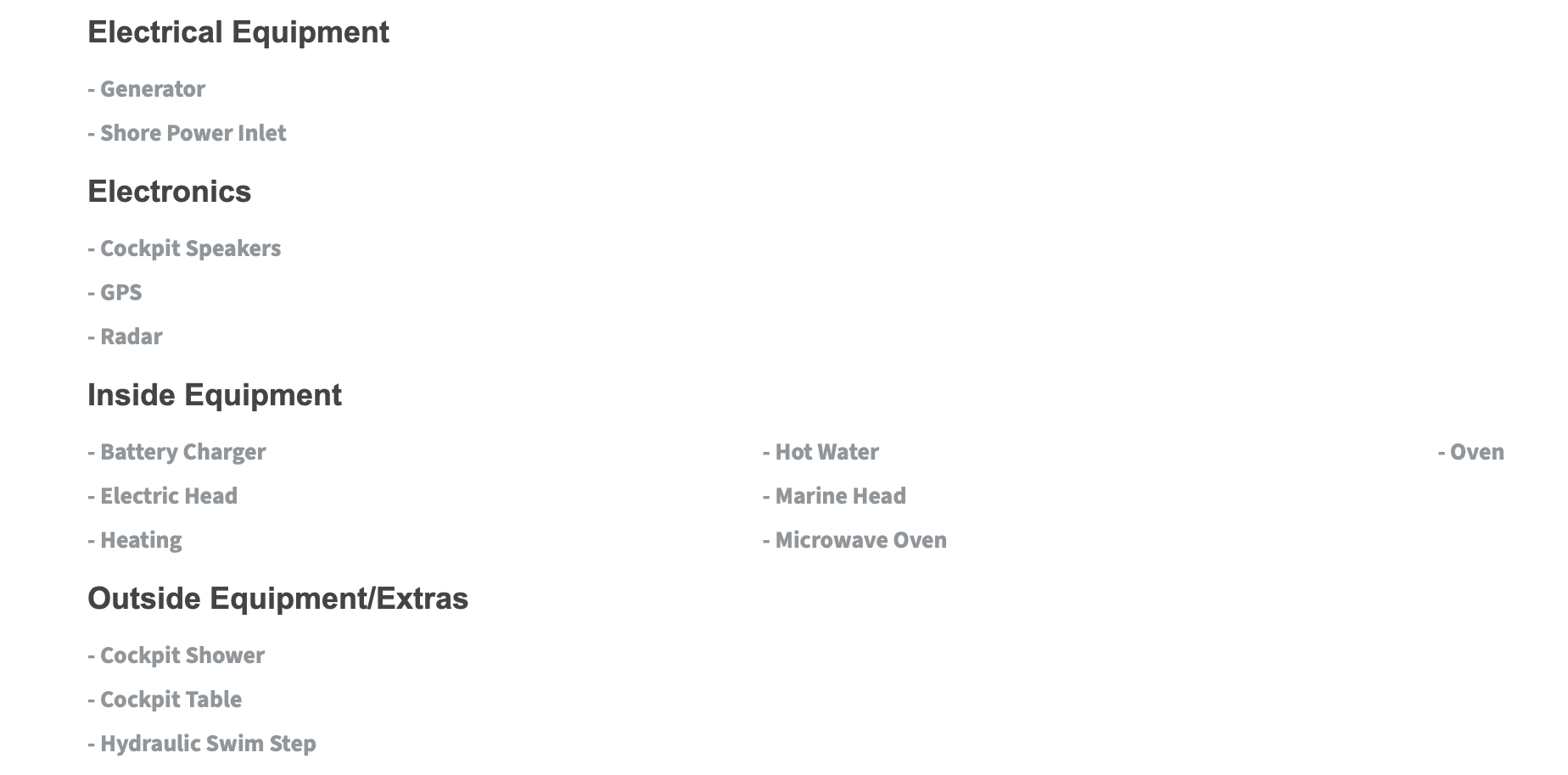 The boat presented on this page is for information purposes only and is not necessarily available for sale and/or rent. This boat is offered under reserve, availability to be verified. This document or this announcement is not contractual. The boat information displayed in the above results is presented in good faith and, while believed to be correct, is not guaranteed. Ita Yachts Canada Inc. and/or ProprioBateau does not offer warranty or assume any legal liability or responsibility for the accuracy, completeness, or usefulness of the information and/or images displayed, as they may not be current or may be images of a comparable boat. All boat information is subject to change without notice and is without warranty. This boat may be offered by another broker open to co-brokerage.