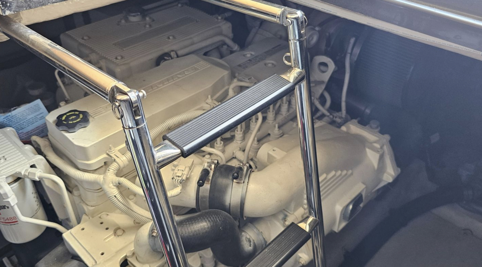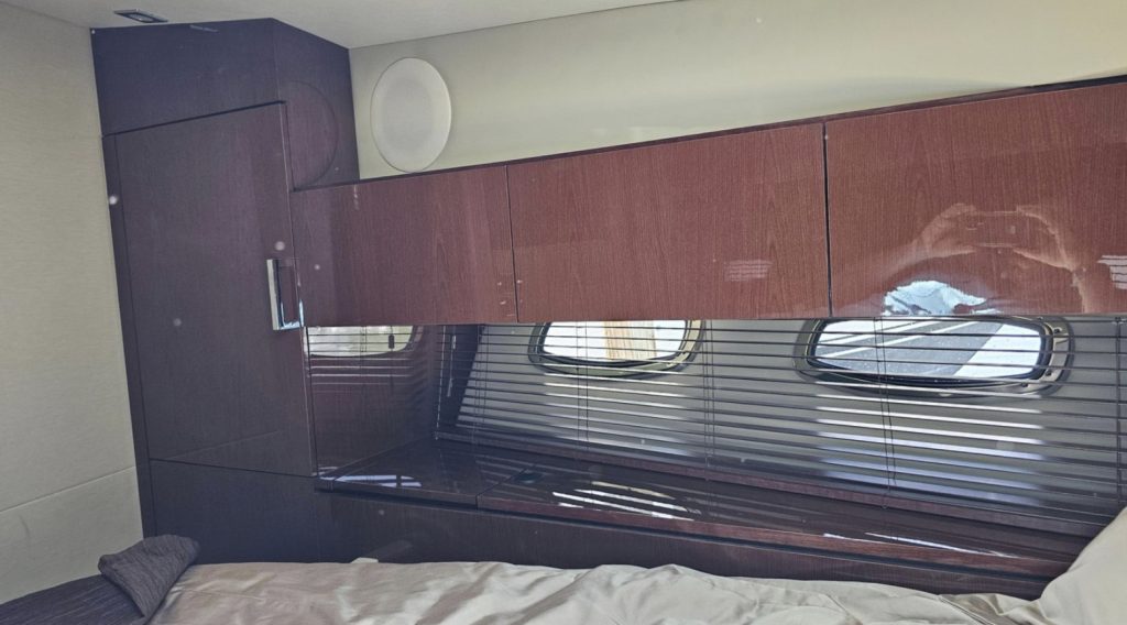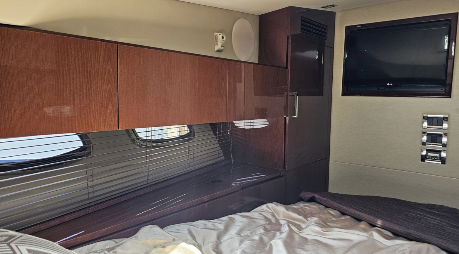 Powered by twin Cummins Zeus QSB 6.7 inboard engines, each delivering an impressive 473 horsepower, this yacht promises exhilarating speed and reliability. The innovative POD Drive system enhances maneuverability, making docking a breeze with its joystick control feature.