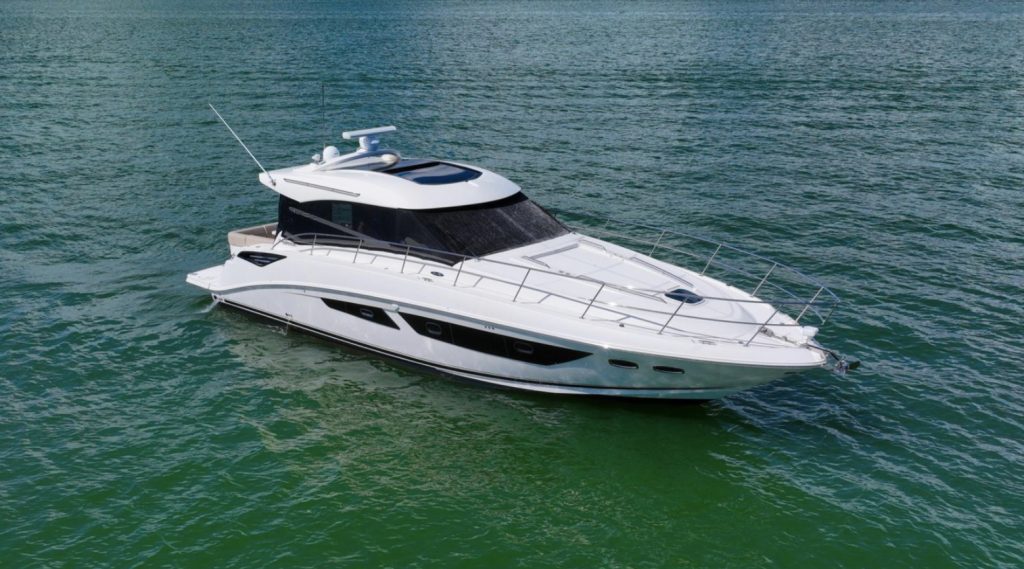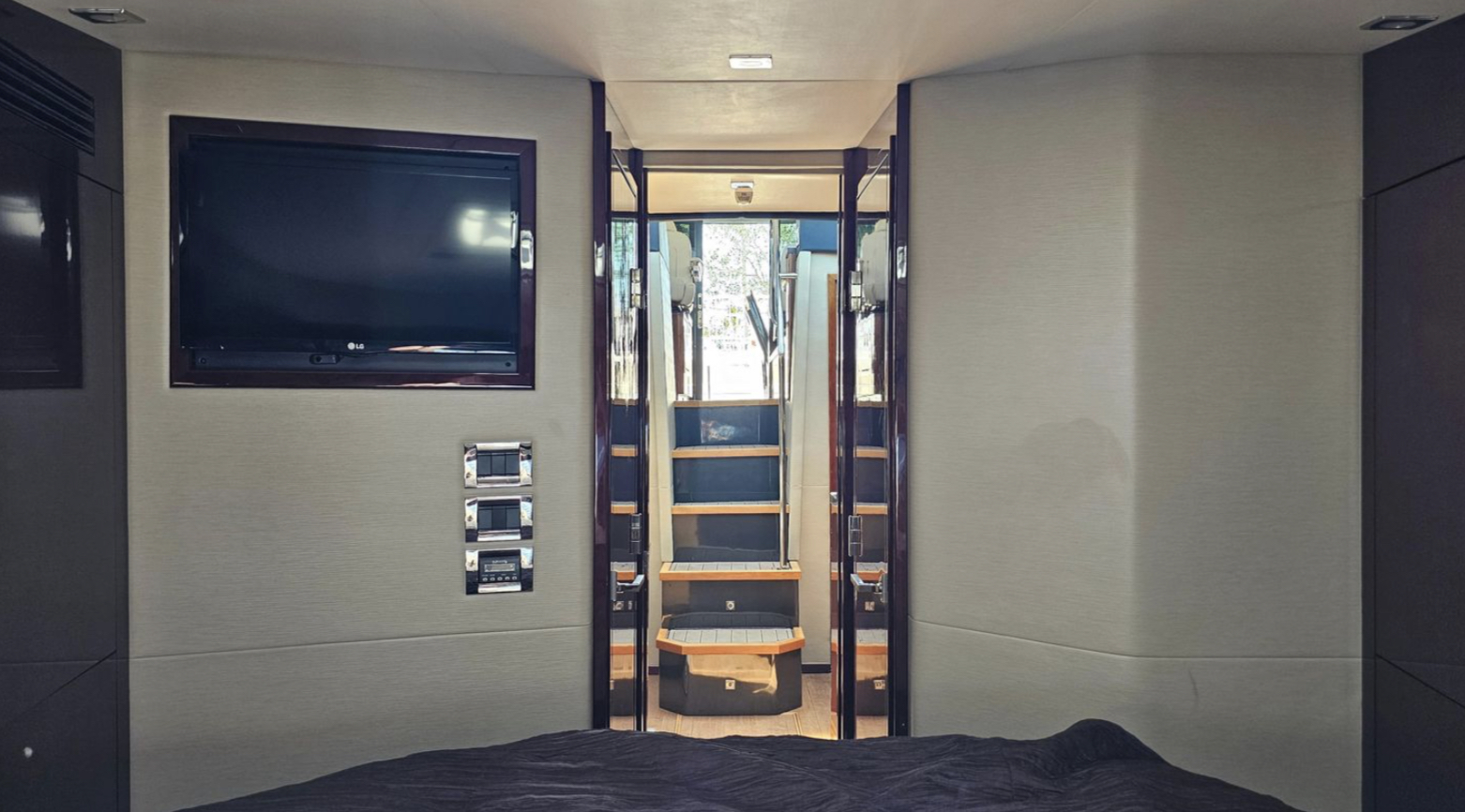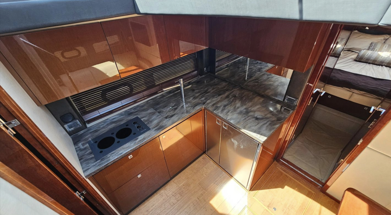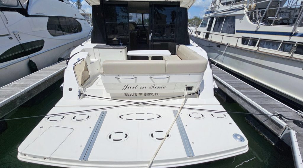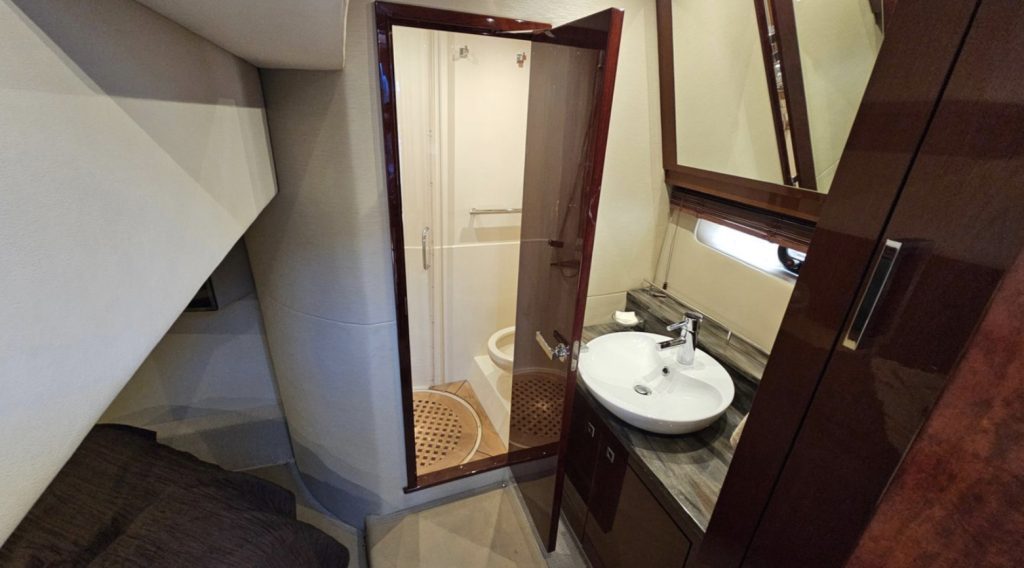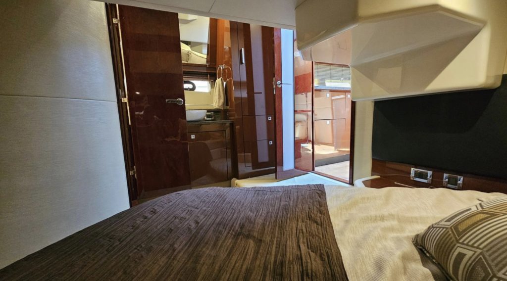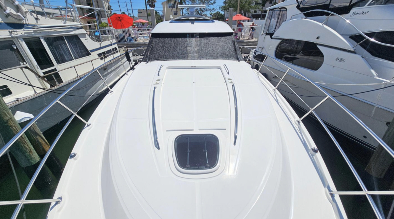 This vessel has a Hydraulic Swim platform, cockpit icemaker, refrigerator and grill. Coupe doors open into the upper salon with TV, refrigerator and seating for 10.