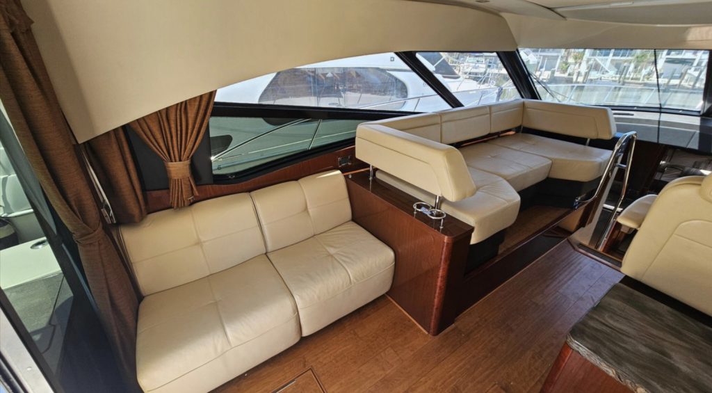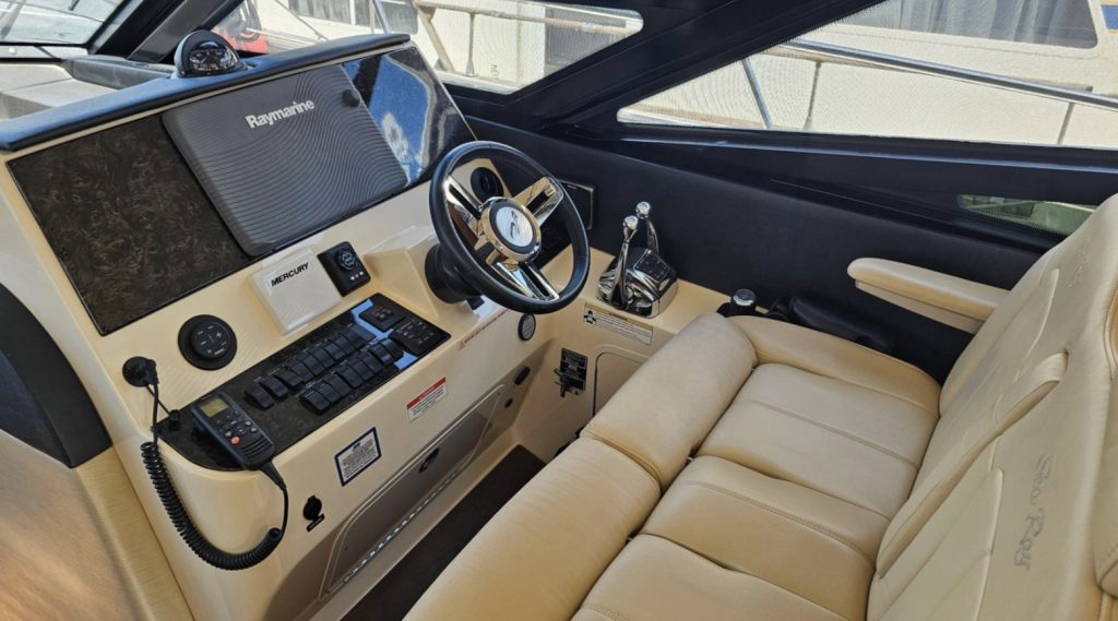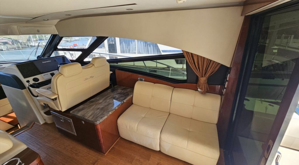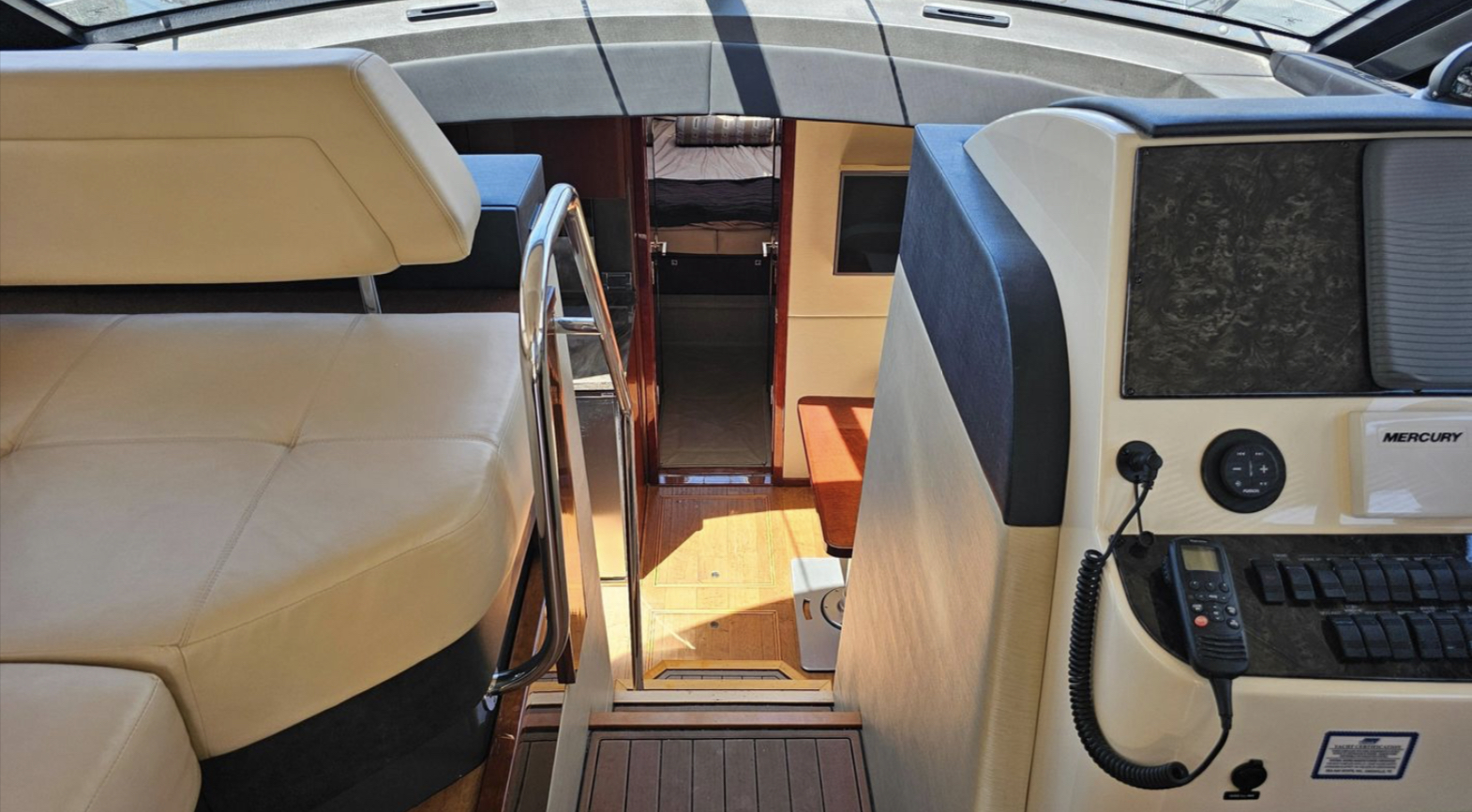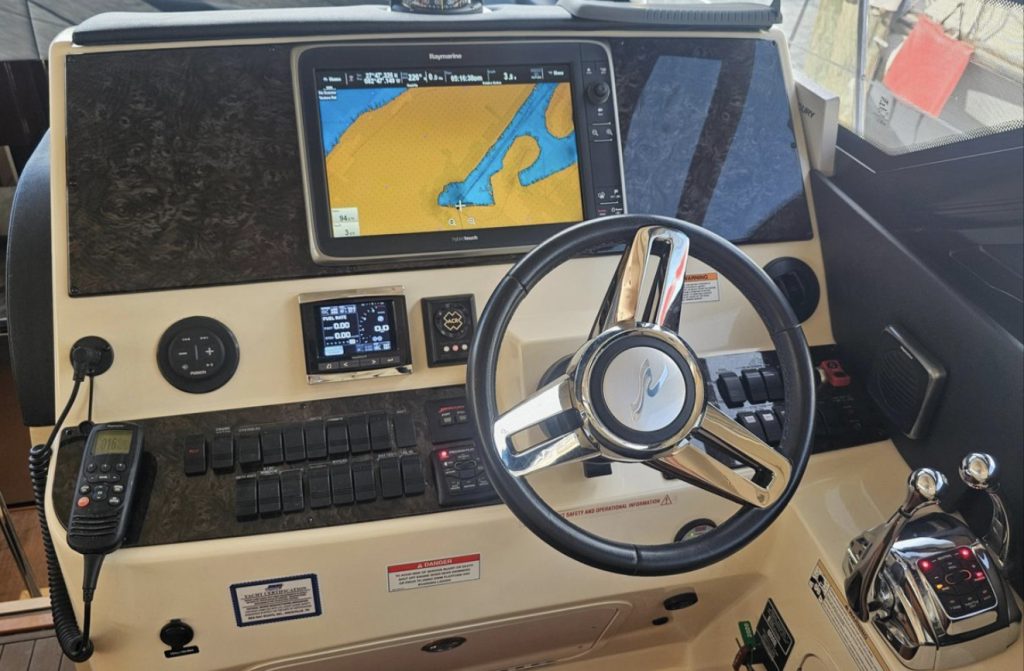 Raymarine Electronics, VHF Radio, Joystick docking with Skyhook and Autopilot. The open layout opens up to the lower salon and galley.