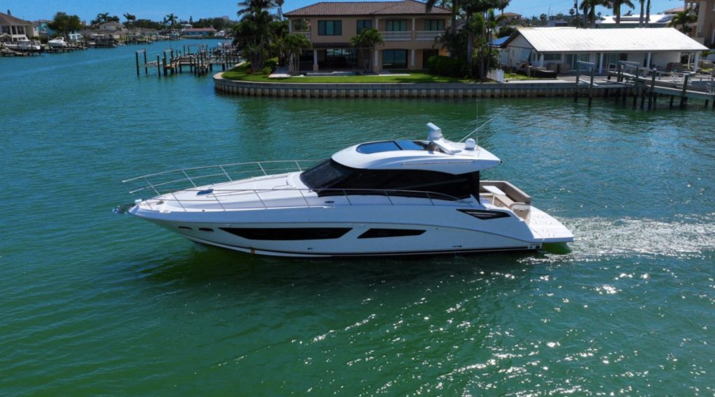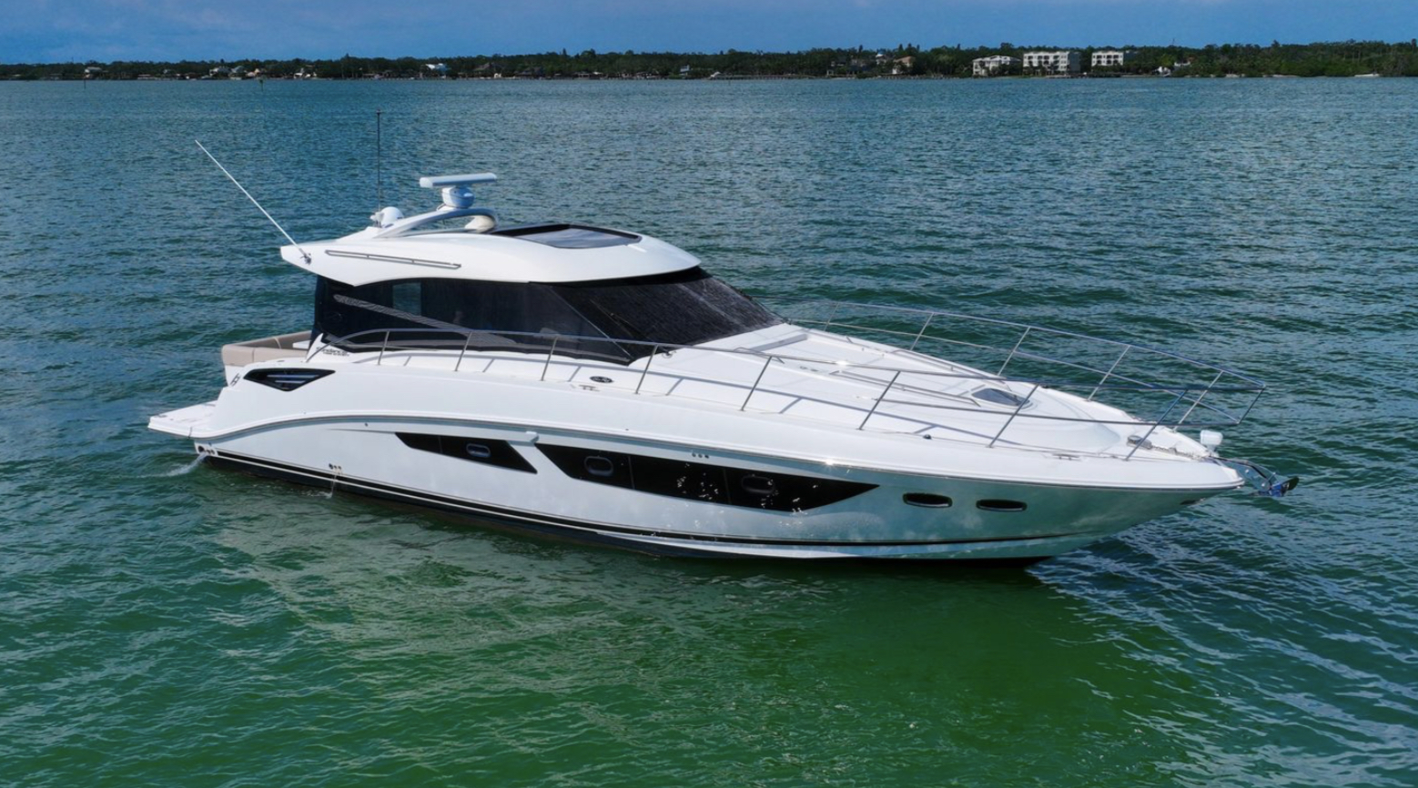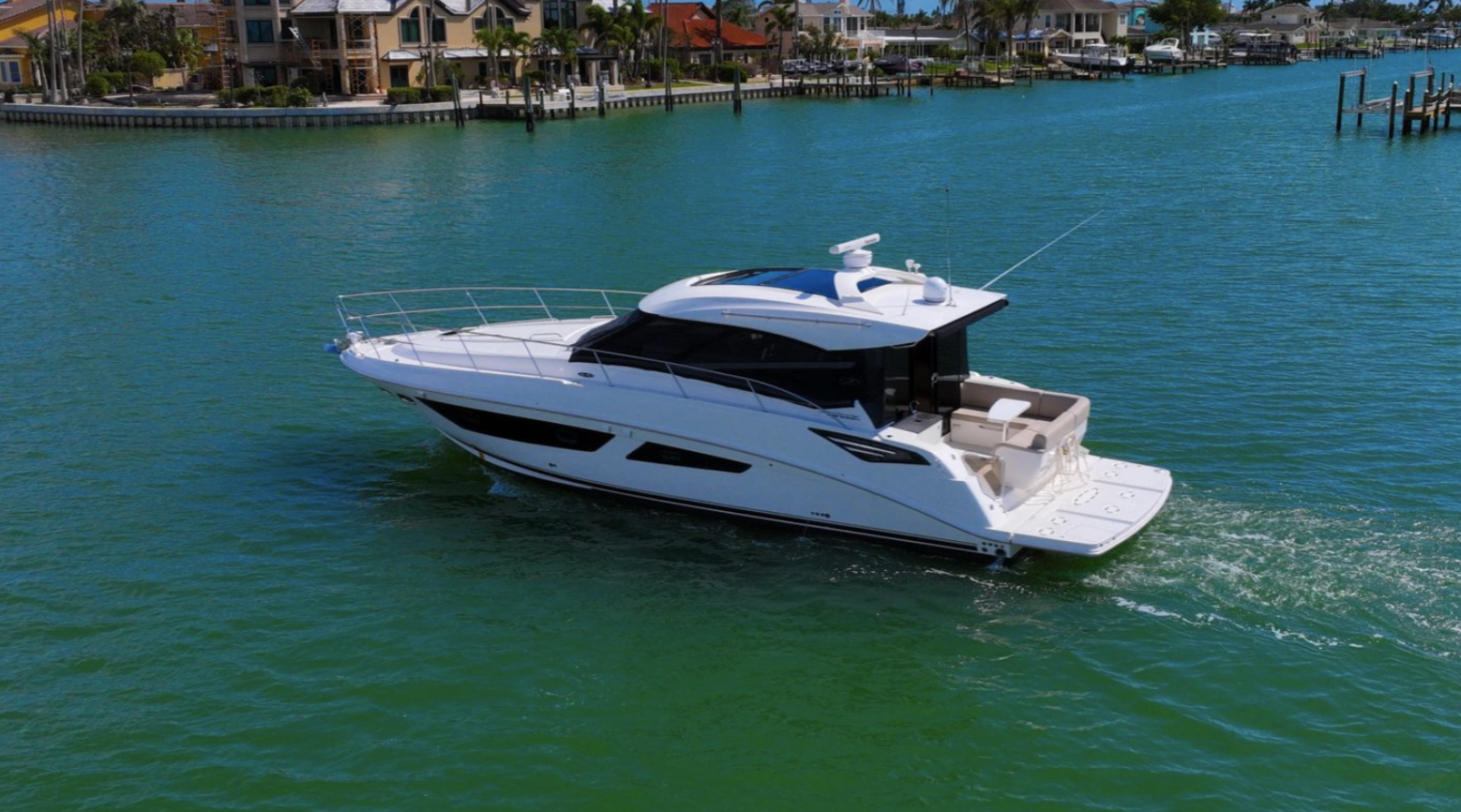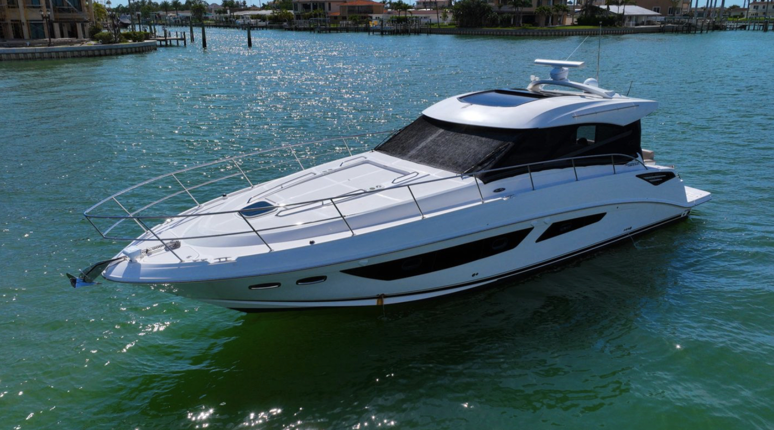 The stunning 2016 Sea Ray 470 Sundancer is a remarkable motor yacht that embodies luxury and performance. With an overall length of 47.25 feet, this vessel boasts a sleek fiberglass hull designed in a Deep Vee shape, ensuring smooth navigation and stability on the water.