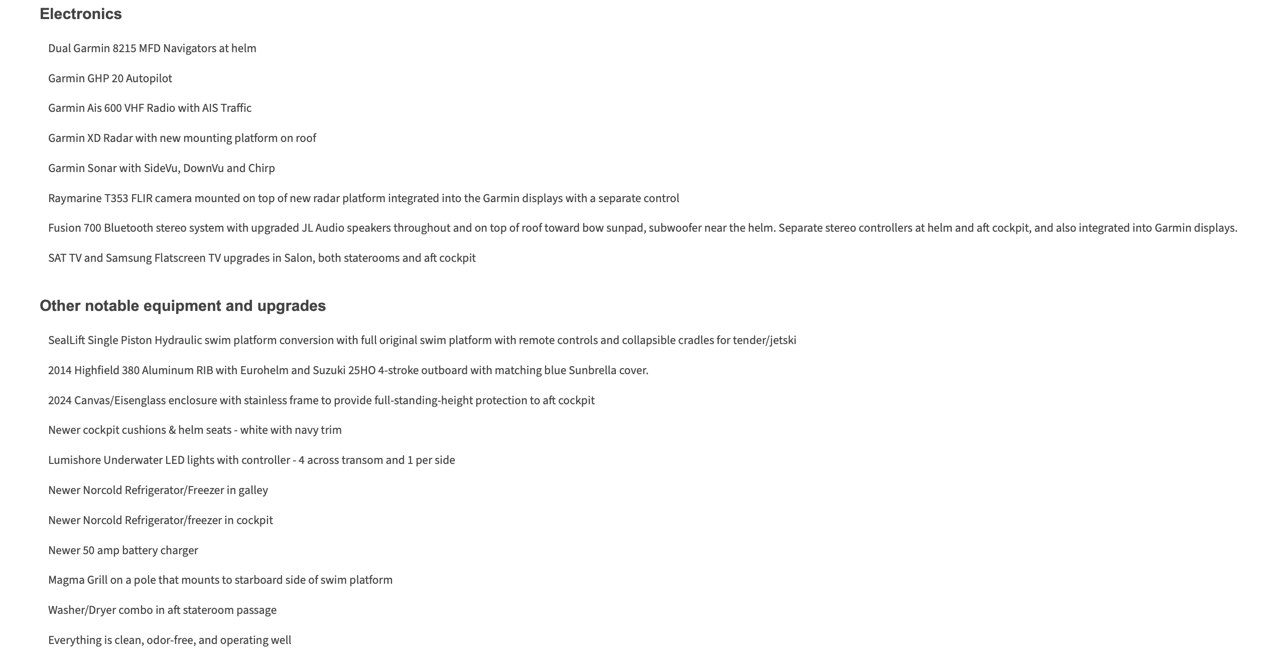 The current owners purchased the yacht in Florida in 2018, where they used it for a couple years and then brought it to Mystic, CT where it has been since. A marine mechanic in the family performs all routine maintenance including winterizing all systems, oil/filter changes in the fall with family members contributing to DIY ablative bottom paint/zincs, washing, waxing, etc… in the spring. The vessel has clearly been very-well cared for based on its overall cosmetic condition, all systems in good working well, and recent upgrades to keep things looking new.