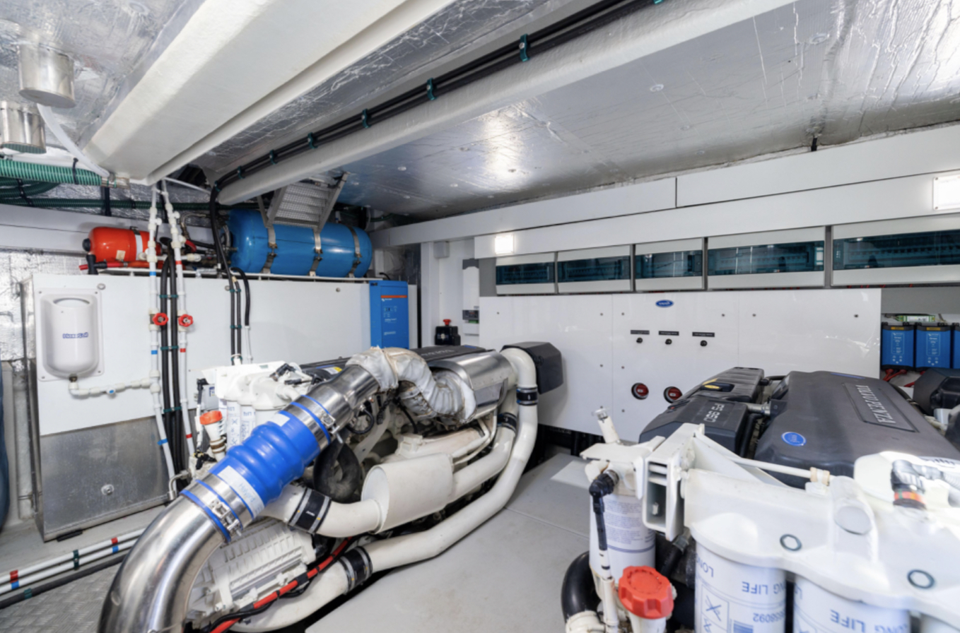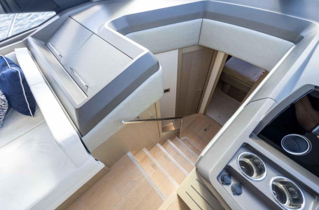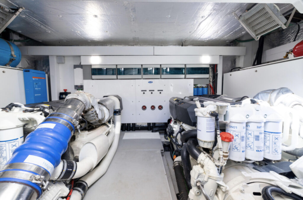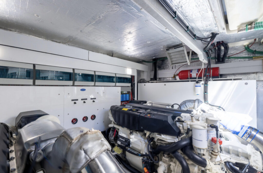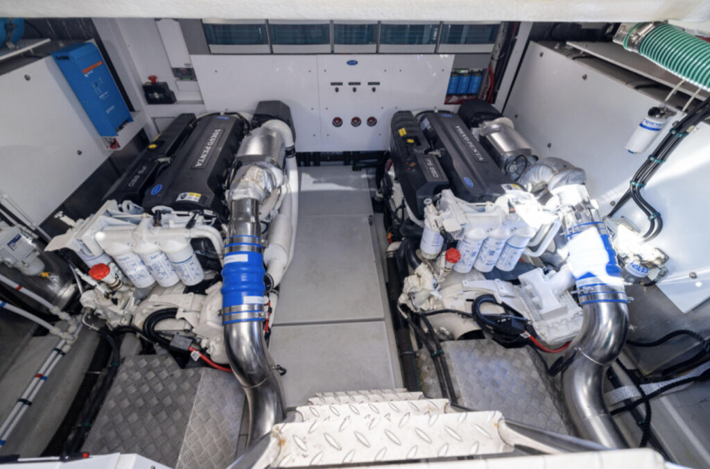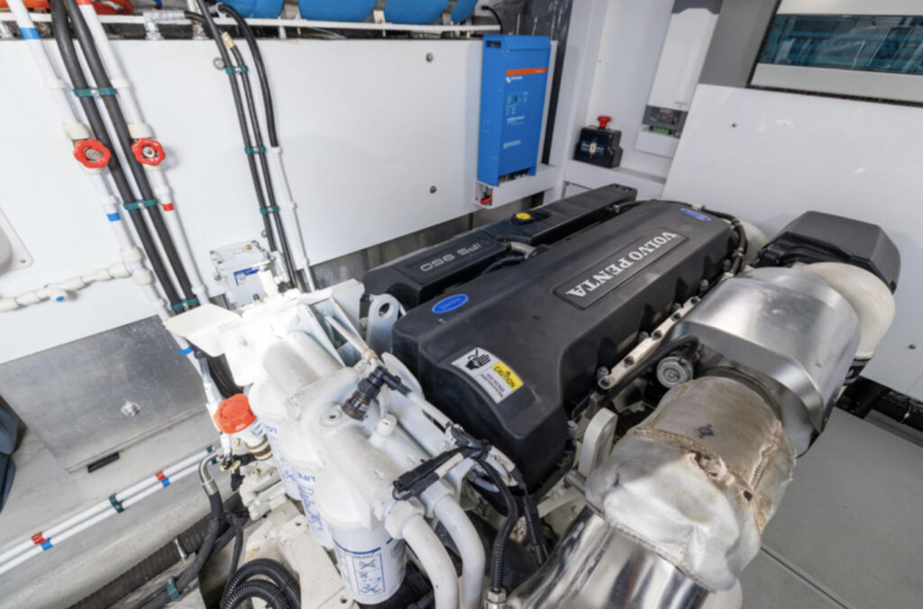 Powered by twin Volvo Penta IPS 950 engines (2 x 725PS), she delivers a smooth, efficient, and dynamic cruising experience. The Volvo Penta IPS DPS (Dynamic Positioning System) with Joystick Control, and Glass Cockpit system at both the main helm and flybridge provide cutting-edge navigation and control. Electronics include a Garmin GMR 624 xHD2 Open Array Radar and dual Garmin GMI 20 speed/depth instruments, while the upgraded VHF system with DSC function ensures reliable communication offshore.