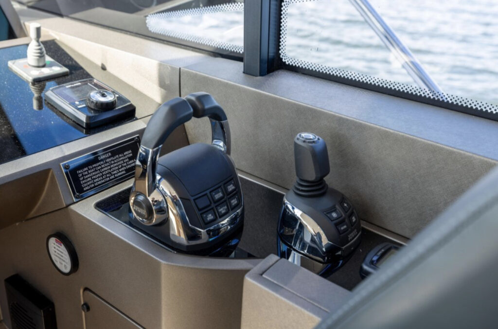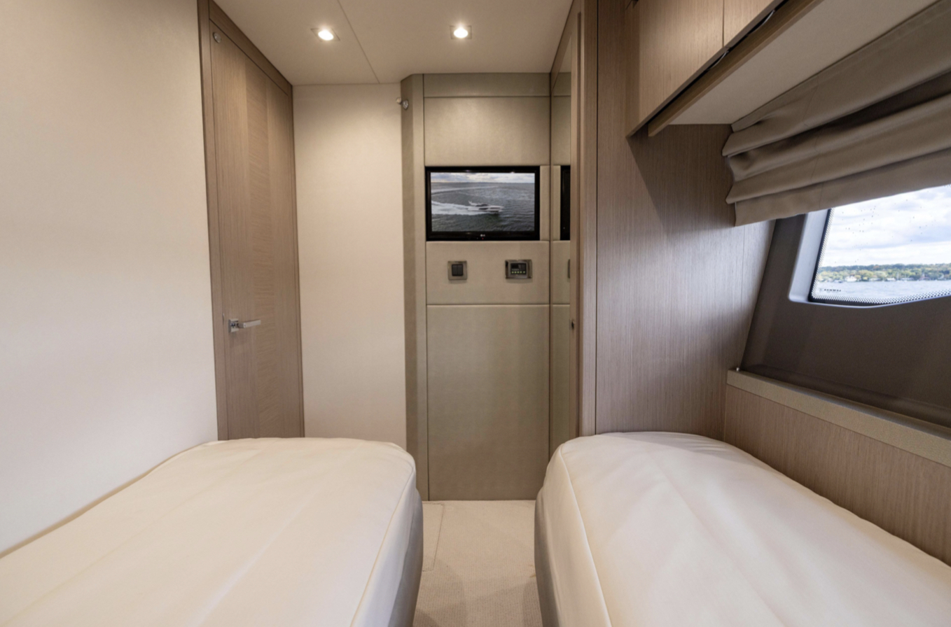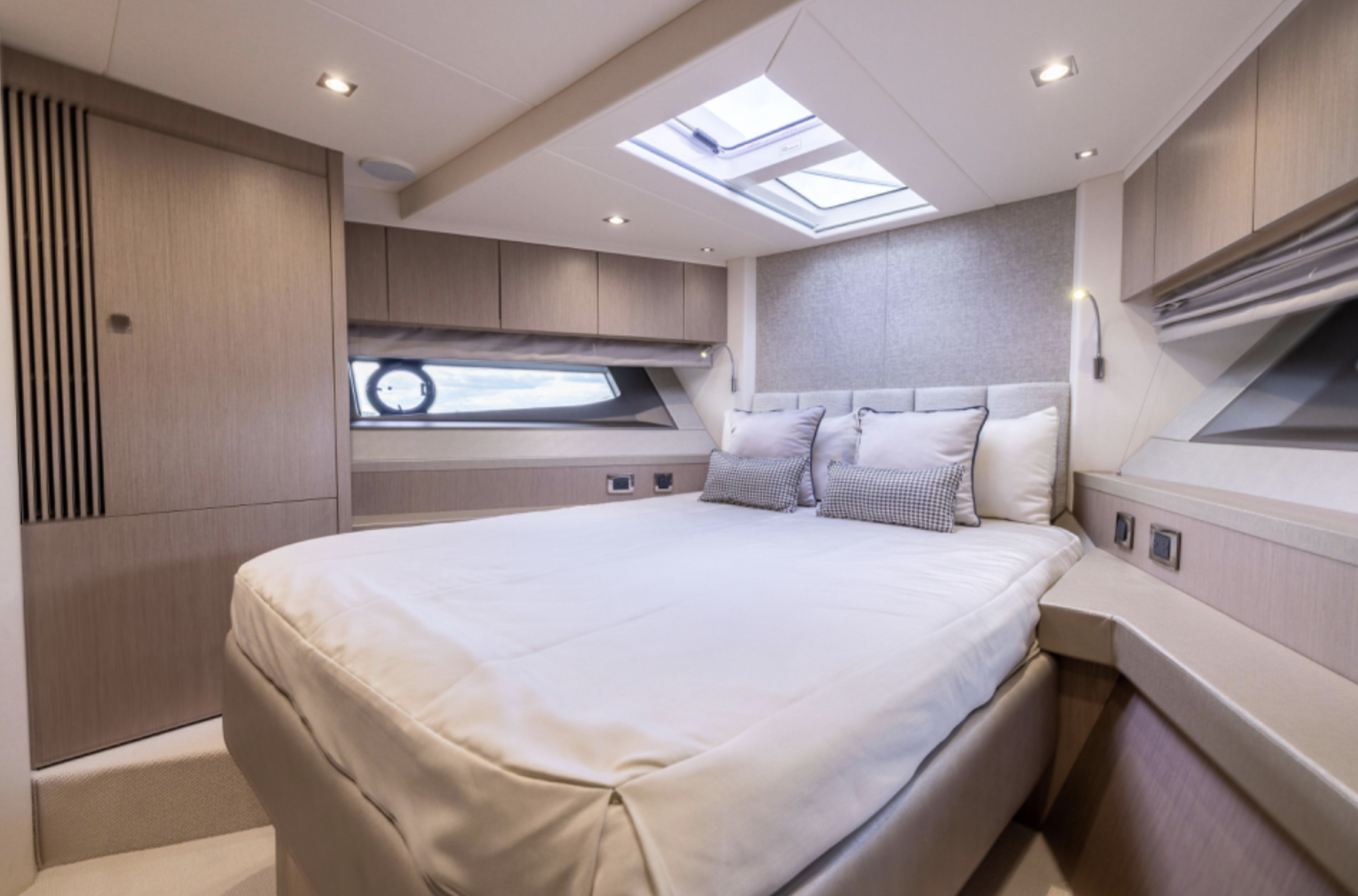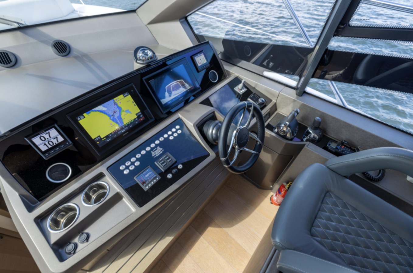 Powered by twin Volvo Penta IPS 950 engines (2 x 725PS), she delivers a smooth, efficient, and dynamic cruising experience. The Volvo Penta IPS DPS (Dynamic Positioning System) with Joystick Control, and Glass Cockpit system at both the main helm and flybridge provide cutting-edge navigation and control. Electronics include a Garmin GMR 624 xHD2 Open Array Radar and dual Garmin GMI 20 speed/depth instruments, while the upgraded VHF system with DSC function ensures reliable communication offshore.