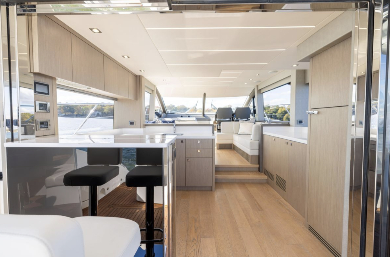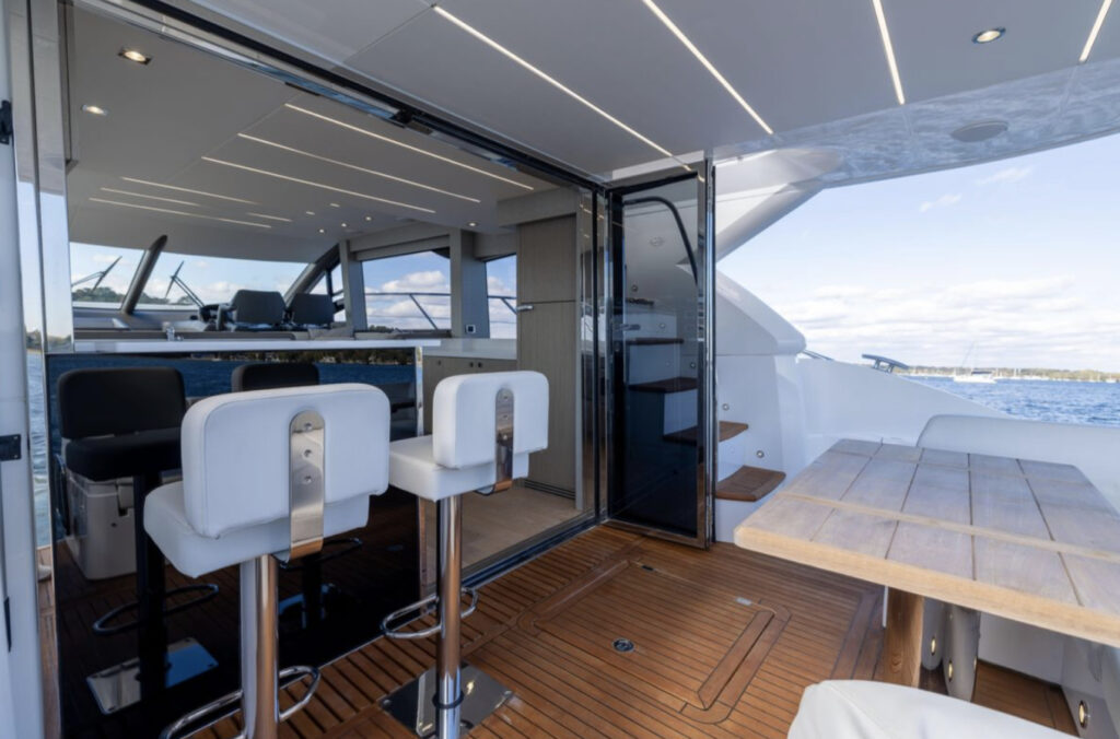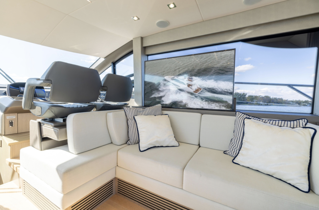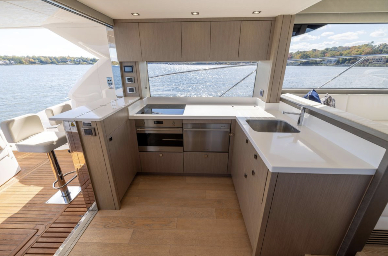 The sought-after Beach Club Package transforms the aft deck into an entertainer’s paradise with a marine grill, fold-down seating, and an overhead shower. Teak decking on the flybridge and cockpit adds a timeless, elegant finish to the outdoor living spaces. Inside, premium finishes such as Cadorin hardwood flooring and Silver Oak satin cabinetry pair with Samsung AV systems for ultimate onboard comfort.