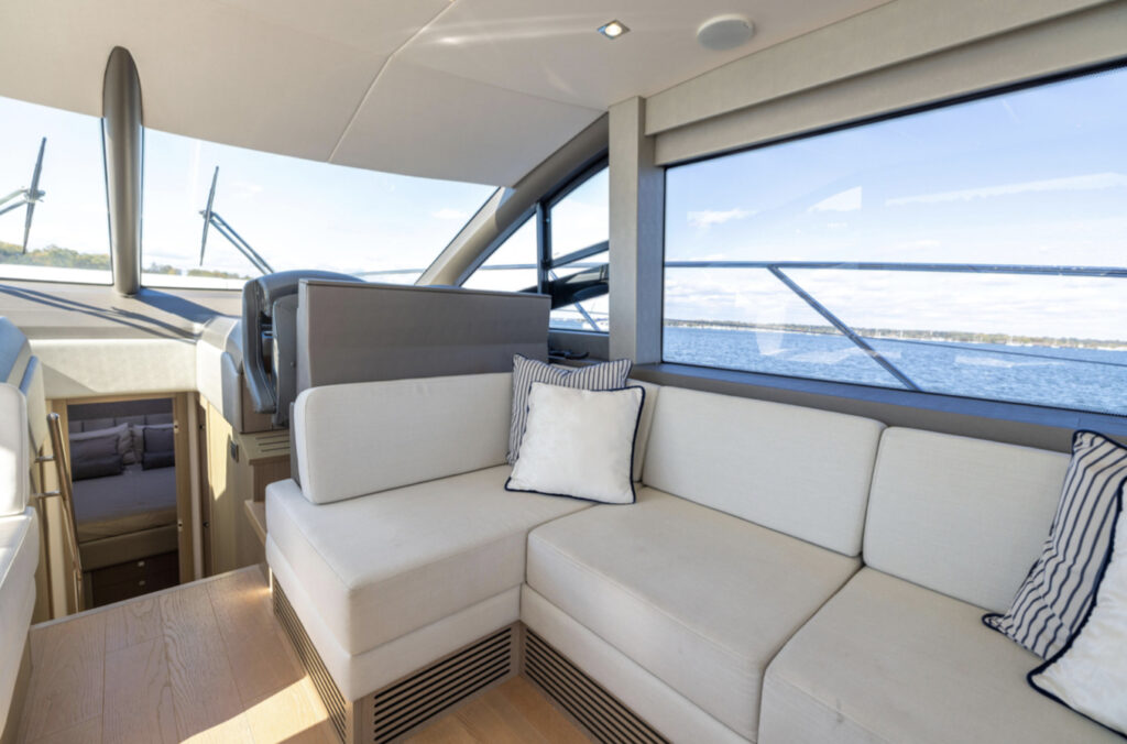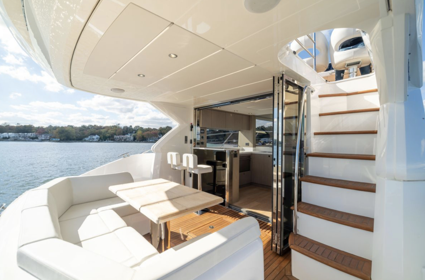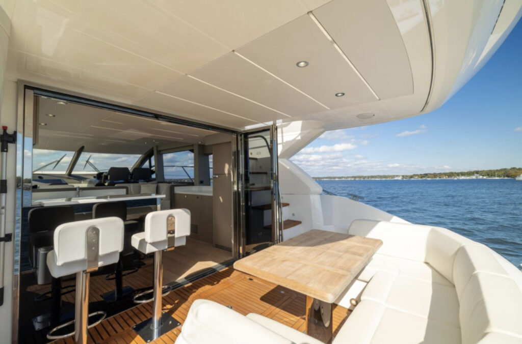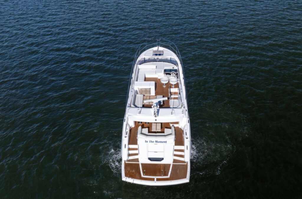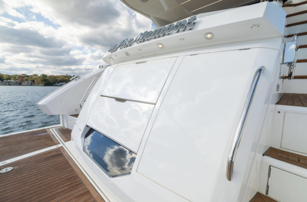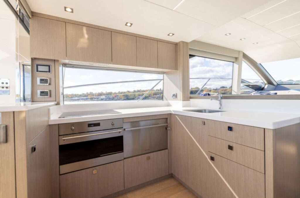 The sought-after Beach Club Package transforms the aft deck into an entertainer’s paradise with a marine grill, fold-down seating, and an overhead shower. Teak decking on the flybridge and cockpit adds a timeless, elegant finish to the outdoor living spaces. Inside, premium finishes such as Cadorin hardwood flooring and Silver Oak satin cabinetry pair with Samsung AV systems for ultimate onboard comfort.