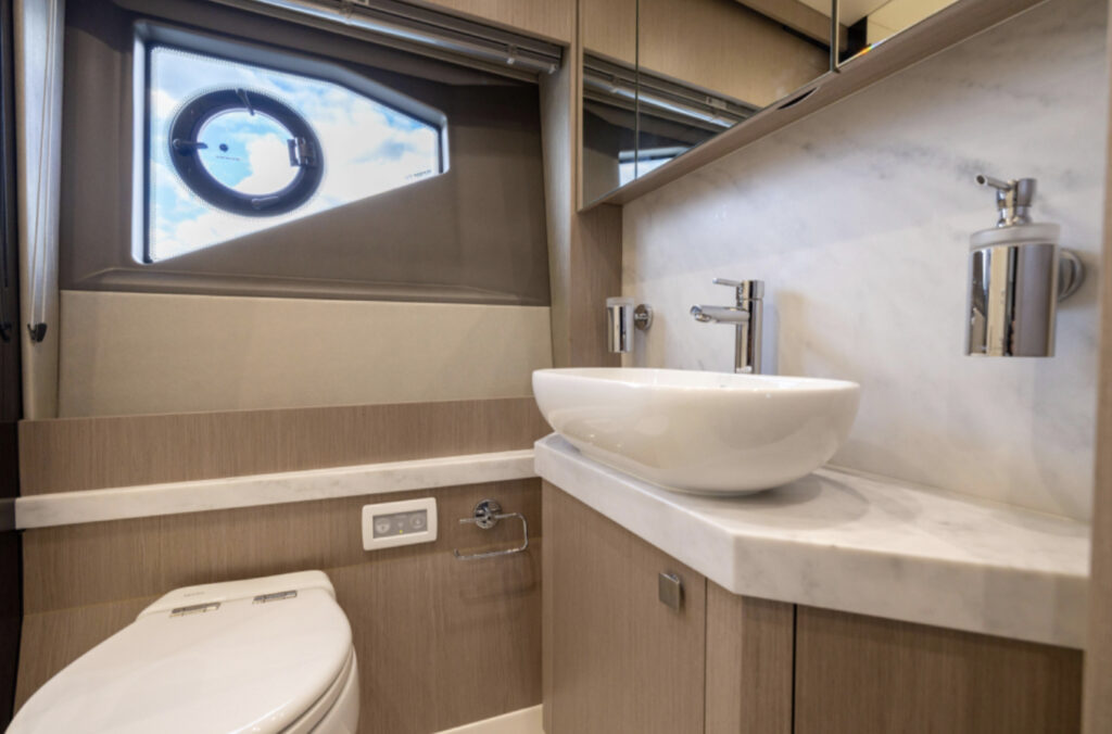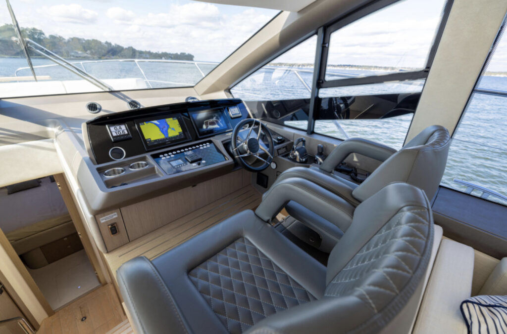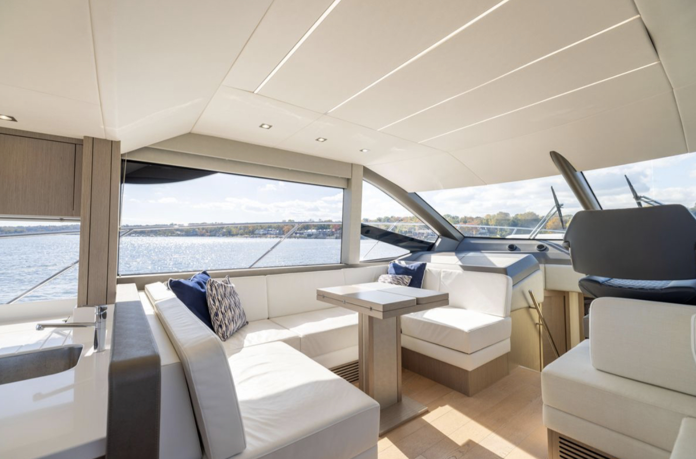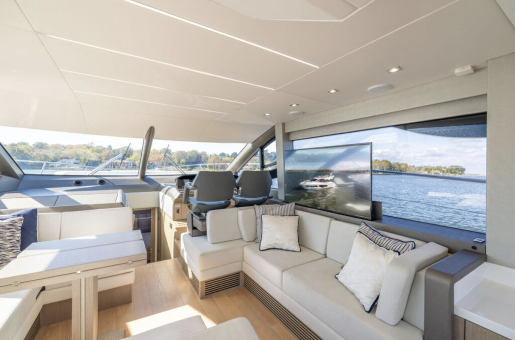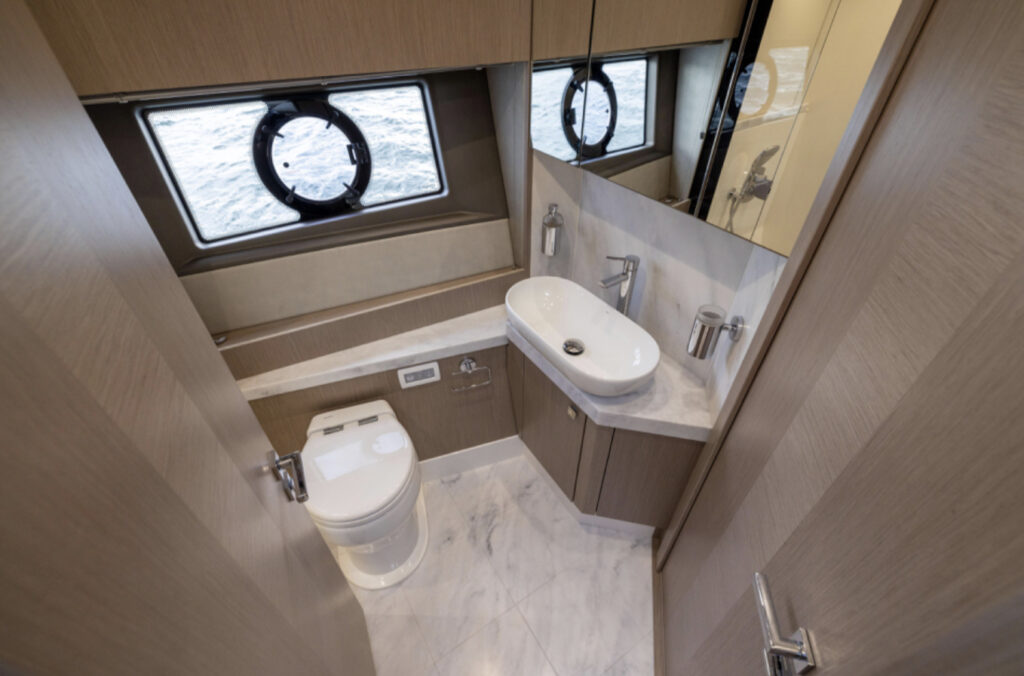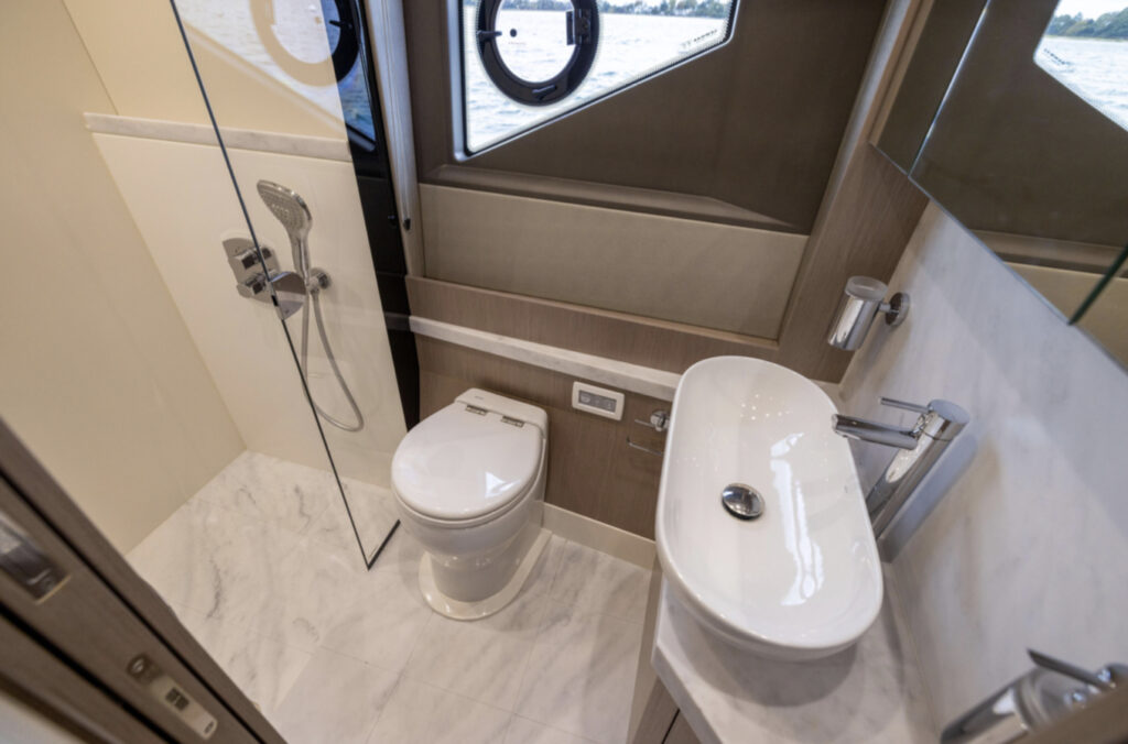The sought-after Beach Club Package transforms the aft deck into an entertainer’s paradise with a marine grill, fold-down seating, and an overhead shower. Teak decking on the flybridge and cockpit adds a timeless, elegant finish to the outdoor living spaces. Inside, premium finishes such as Cadorin hardwood flooring and Silver Oak satin cabinetry pair with Samsung AV systems for ultimate onboard comfort.