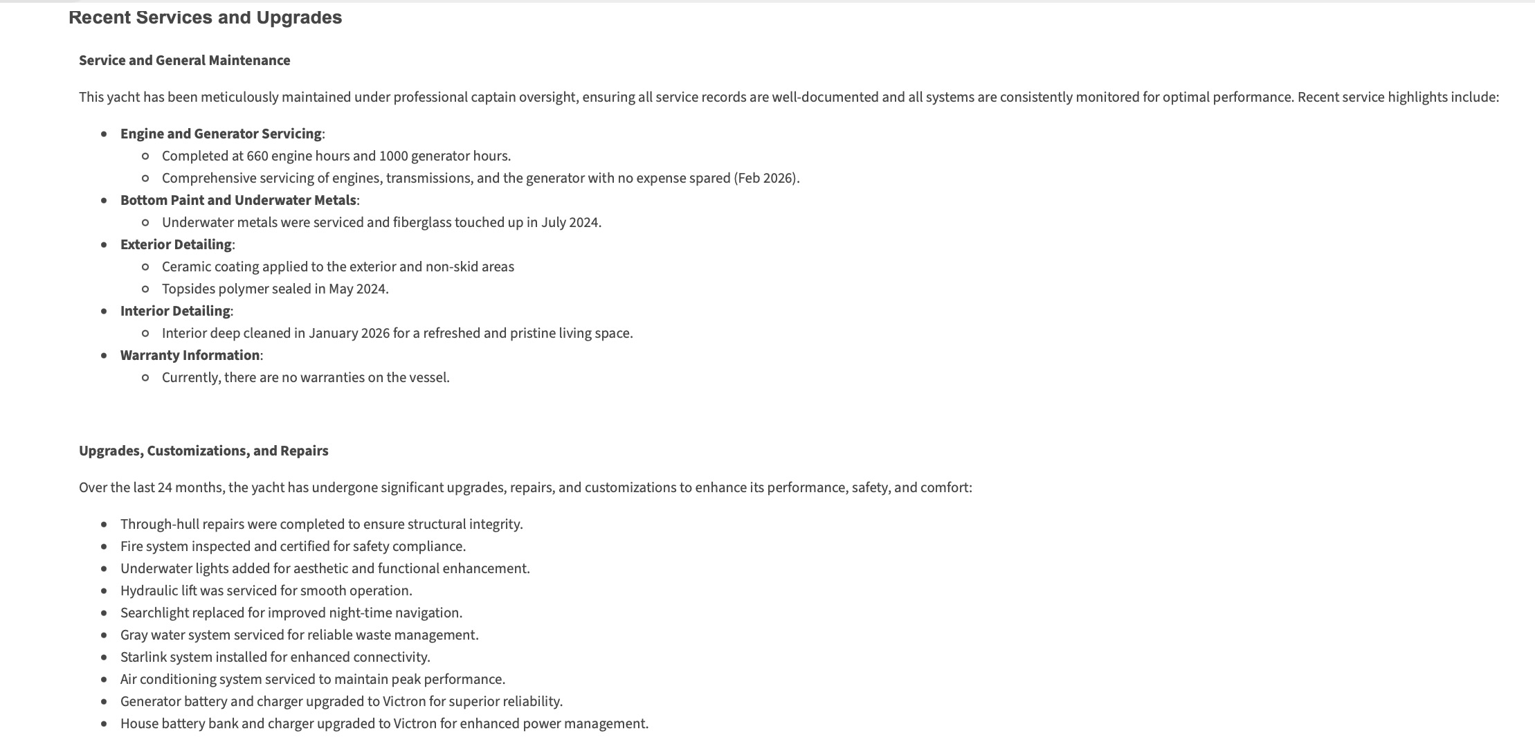 Ce yacht a été méticuleusement entretenu sous la supervision d’un capitaine professionnel, garantissant que tous les dossiers d’entretien sont bien documentés et que tous les systèmes sont constamment surveillés pour des performances optimales. Points saillants des services récents :